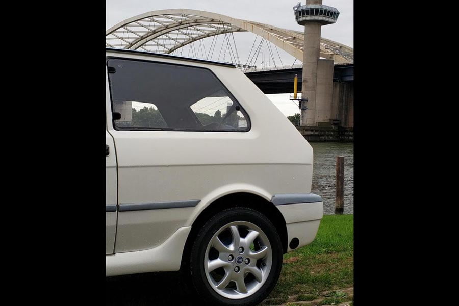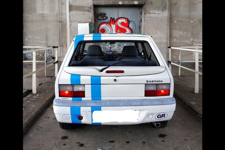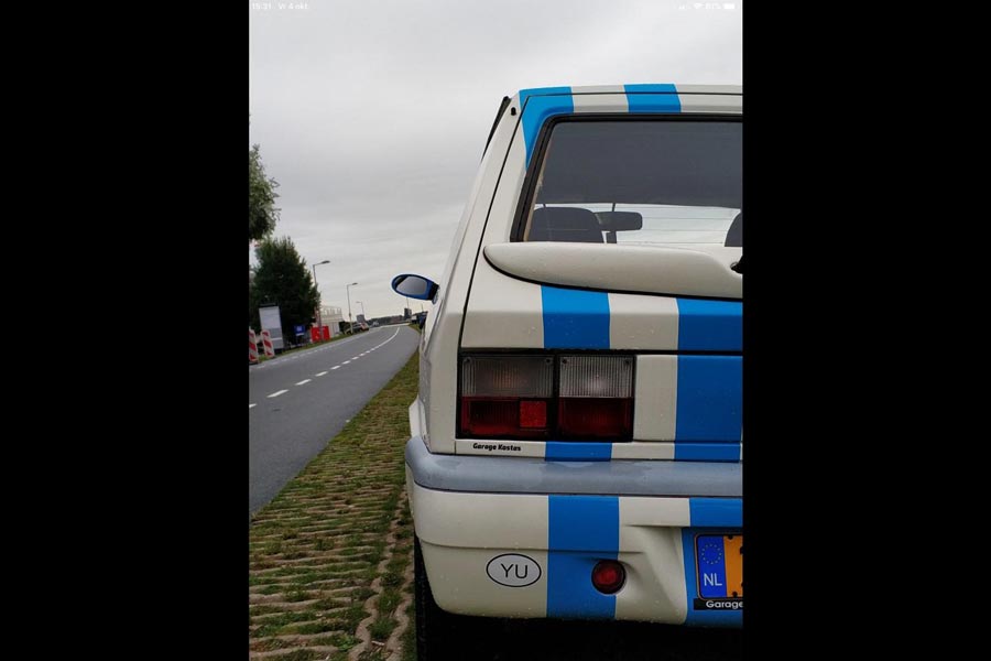 Το Yugo Koral που βλέπετε είναι το ανανεωμένο μοντέλο με τους νέους προφυλακτήρες, μάσκα και φωτιστικά σώματα εμπρός, καθώς και με το αναβαθμισμένο εσωτερικό. Το συγκεκριμένο αυτοκίνητο μας τράβηξε αρχικά το ενδιαφέρον από την ελληνική σημαία που είδαμε στο εμπρός φτερό του και το γεγονός ότι το αυτοκίνητο πωλείται στην Ολλανδία (η αγγελία βρίσκεται στο autoscout24.com). Βλέποντας μετά μία προς μία τις φωτογραφίες επισημάναμε το αυτοκόλλητο «Garage Kostas» που υπάρχει κάτω από το πίσω αριστερό φανάρι και το «GR» στον προφυλακτήρα. Με μια γρήγορη αναζήτηση βρήκαμε ότι υπάρχει συνεργείο Garage Kostas στην Ολλανδία.