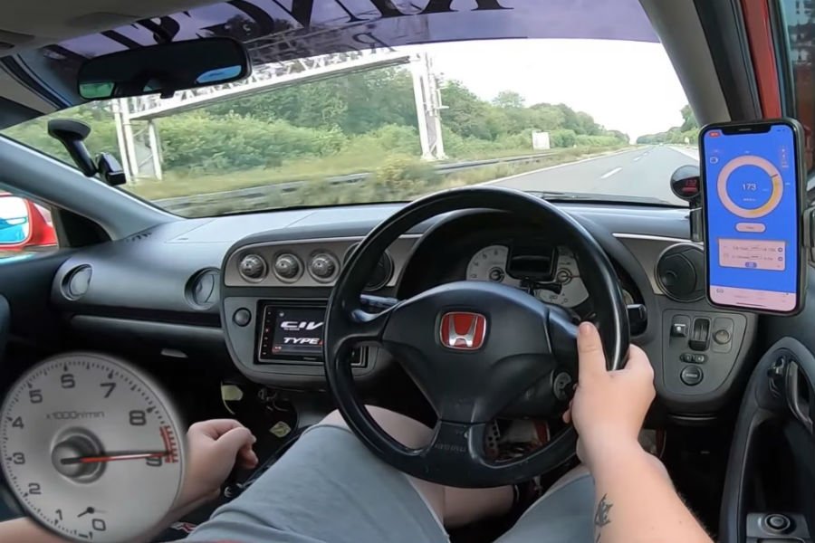 Το εν λόγω Integra Type R «φωνάζει» ότι είναι JDM αφενός από το τιμόνι στα δεξιά (κάτι που θα μπορούσε να ανήκει και σε αγγλικό ή κυπριακό), αφετέρου από την ένδειξη του κοντέρ που σταματά στα 180 χλμ./ώρα. Το ανώτατο και υποχρεωτικό επιτρεπόμενο όριο στην Ιαπωνία, που τηρείται μέσω ηλεκτρονικού περιοριστή. Ο οποίος προφανώς εδώ έχει αφαιρεθεί, καθώς η ένδειξη στο smartphone έφτασε πάνω από τα 200 χλμ./ώρα – και με μια σχέση στο 6αρι χειροκίνητο «κάβα». Το λογότυπο του Civic Type R στην οθόνη του συστήματος πολυμέσων προκαλεί ένα μπέρδεμα, υποδηλώνοντας ψηφιακή «μεταμόσχευση» από κάποιο υπερτροφοδοτούμενο «Τάπερ» (είτε το σημερινό, είτε το προηγούμενο – αμφότερα με συστήματα πολυμέσων).