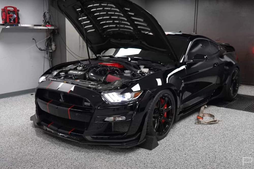 Με τέτοια εμφάνιση ακόμα και εργοστασιακή να ήταν, θα έμοιαζε πως έχει τουλάχιστον 900 άλογα. Εδώ, όμως, σχεδόν τόσα άλογα παράγονται με τη χρήση αμόλυβδης 93 οκτανίων. Βάζοντας το αμερικανικό «ζουμί» στο ρεζερβουάρ, η GT500 απέδωσε 876 ίππους και 858 Nm στο δυναμόμετρο. Με βιοαιθανόλη E85 η πρώτη μέτρηση έδειξε 991 άλογα και 938 Nm, ενώ κατόπιν ρυθμίσεων στη χαρτογράφηση του εγκεφάλου η οθόνη εμφάνισε 1.070 ίππους και 1.060 Nm ροπής! Μιλάμε για 310 άλογα και 213 Nm παραπάνω από την εργοστασιακή εκδοχή, μέσω διαφορετικής ECU και γραναζώματος στους λοβούς του κομπρέσορα. Χωρίς καν, δηλαδή, να αλλάξει η εξάτμιση, η GT500 ξεπερνά το Tesla Model S Plaid σε ιπποδύναμη. Και, φυσικά, με έναν ήχο που στοιχειώνει όνειρα και φαντασιώσεις.