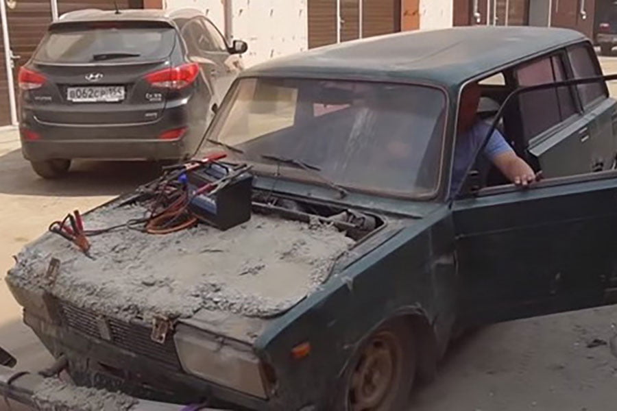 Το κανάλι Garage 54 στο YouTube που επιμελείται μια ομάδα Ρώσων, κατά καιρούς έχει κάνει διάφορα… πειράματα. Αυτή τη φορά είπαν να ρίξουν τσιμέντο στο χώρο του κινητήρα ενός Lada για να δουν αν αυτός θα είναι ακόμα λειτουργικός. Έτσι έφεραν τη μπετονιέρα, η οποία έριξε αρκετή ποσότητα τσιμέντου στον κινητήρα και αφού το έστρωσαν καλά, το άφησαν να στερεοποιηθεί για περίπου μια εβδομάδα. Τότε ξεκίνησαν και τα πειράματα των μηχανικών.