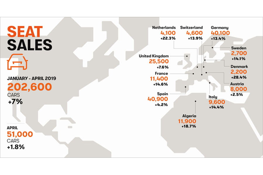 Επιπλέον, η SEAT διατήρησε τις πωλήσεις της στην Ισπανία (103.300) και επέκτεινε την ηγετική της θέση σε μια αγορά που σημείωσε πτώση σχεδόν κατά 6%. Οι παγκόσμιες πωλήσεις αυξήθηκαν επίσης σε βασικές αγορές όπως η Γαλλία και η Ιταλία, όπου η SEAT αυξήθηκε περισσότερο από 20% (34.500, +20.4%) και σχεδόν 30% (24.500, + 8.4%) αντίστοιχα.