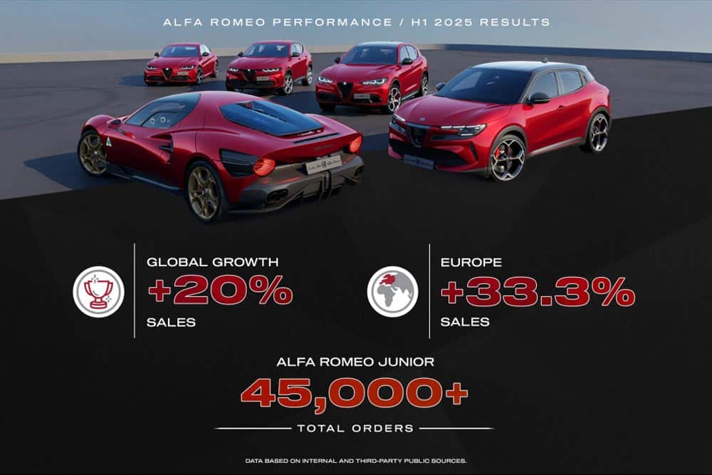 Η Alfa Romeo συνεχίζει να αναπτύσσεται παγκοσμίως, καταγράφοντας αύξηση 20% στις ταξινομήσεις το πρώτο 6μηνο του 2025 σε σύγκριση με την ίδια περίοδο του 2024, γεγονός που αποδίδεται και στο πετυχημένο λανσάρισμα της Junior. Το νέο μικρό SUV της μιλανέζικης φίρμας ξεπέρασε τις 45.000 παραγγελίες λίγους μήνες από την κυκλοφορία του σε 38 χώρες, ενώ το 17% αφορούσε την πλήρως ηλεκτρική έκδοση.