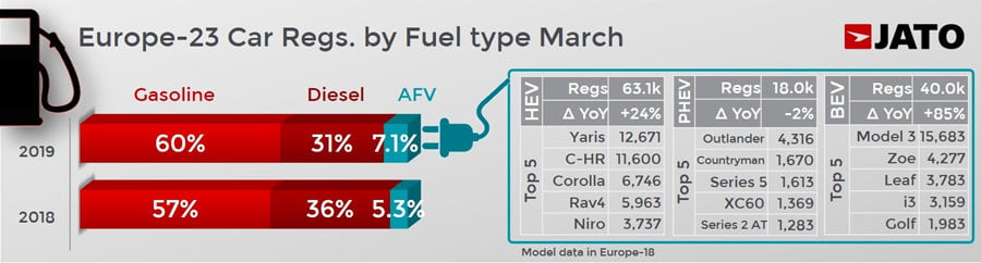 Τα αυτοκίνητα με κινητήρες πετρελαίου συνέχισαν να χάνουν έδαφος, καθώς το Μάρτιο το μερίδιό τους στην Ευρώπη έφτασε το 31% (έναντι 36,2% το Μάρτιο του 2018 και 44,8% το Μάρτιο του 2017), το χαμηλότερο από τον Σεπτέμβριο του 2000. Κερδισμένα είναι τα οχήματα βενζίνης με μερίδιο 60%, ενώ για πρώτη φορά τα ηλεκτροκίνητα αυτοκίνητα (BEV, PHEV, HEV) ξεπέρασαν το φράγμα των 100.000 ταξινομήσεων και συγκεκριμένα έφτασαν τις 125.400 ταξινομήσεις. Μεγαλύτερη μείωση στα ντίζελ αυτοκίνητά τους είδαν οι μάρκες Mercedes, Renault, Peugeot, Ford και Land Rover, ενώ αντιθέτως οι Volkswagen, Skoda και SEAT αύξησαν τις ταξινομήσεις τους.