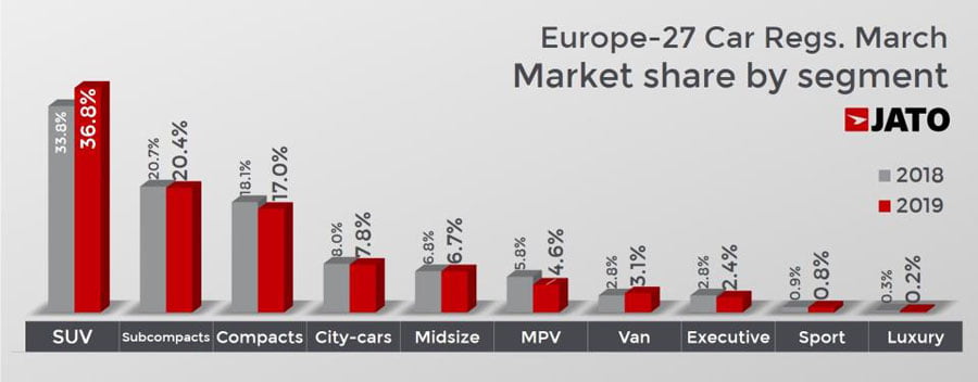 Τα SUV συνέχισαν την ανοδική τους πορεία με μερίδιο 36,8% της Ευρωπαϊκής αγοράς το Μάρτιο του 2019 (33,8% πέρυσι) και 650.300 ταξινομήσεις, οι οποίες το πρώτο 3μηνο του 2019 έφτασαν τα 1,53 εκατομμύρια οχήματα (+6,8%). Τις πιο πολλές ταξινομήσεις το πρώτο 3μηνο του 2019 έχουν συγκεντρώσει στα μικρά SUV το VW T-Roc (589.000), στα μικρομεσαία SUV το Nissan Qashqai (650.000), στα μεσαία SUV το Volvo XC60 (222.000) και στα μεγάλα SUV η BMW X5 (67.000).