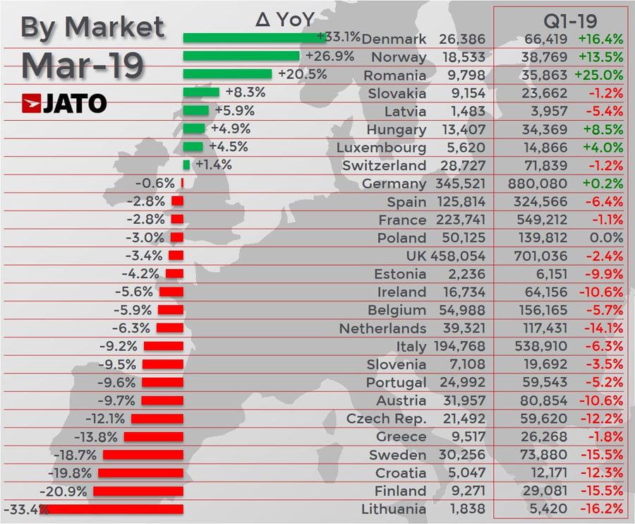 Όσον αφορά τις ταξινομήσεις ανά χώρα, στις περισσότερες υπήρξε πτώση τόσο το Μάρτιο του 2019, όσο και το πρώτο 3μηνο του έτους. Δανία, Νορβηγία και Ρουμανία έχουν σημειώσει μεγάλη άνοδο, ενώ στο αντίθετο άκρο έχουν βρεθεί Λιθουανία, Φινλανδία, Κροατία και Σουηδία.