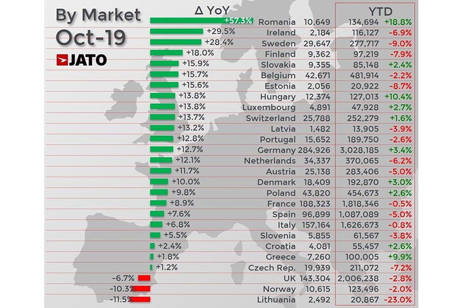 Σύμφωνα με τα στοιχεία της JATO Dynamics, ο μήνας Οκτώβριος που μας πέρασε ήταν ο καλύτερος της τελευταίας 10ετίας, καθώς στις ευρωπαϊκές αγορές ταξινομήθηκαν συνολικά 1.208.700 αυτοκίνητα (+8,2% σε σχέση με τον περσινό Οκτώβριο), ενώ σε 17 από τις 27 χώρες της Ευρώπης, η αύξηση αγγίζει διψήφιο νούμερο. Γεγονός που οφείλεται και στην αύξηση της ζήτησης για ηλεκτρικά, αλλά και plug-in hybrid αυτοκίνητα. Βέβαια σε αυτό το σημείο πριν συνεχίσουμε την ανάλυση μας, πρέπει να σταθούμε στην εκρηκτική άνοδο της Porsche, όπου μόνο τον μήνα Οκτώβριο πούλησε 8.819 μοντέλα, με το ποσοστό αύξησης να αγγίζει το 395%!