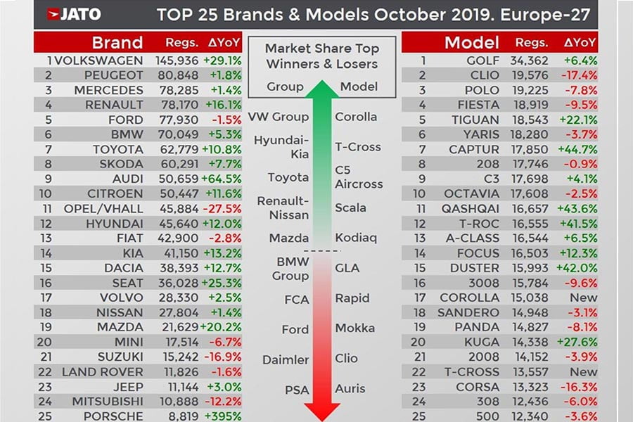 Για τα SUV τώρα, για ακόμα μια χρονιά ήταν πρώτα στη ζήτηση, όπου μόνο το μήνα Οκτώβριο στις ευρωπαϊκές αγορές, ταξινομήθηκαν 484.400 μοντέλα, νούμερο αυξημένο κατά 22% συγκριτικά με τον ίδιο μήνα του 2018. Πιο συγκεκριμένα, τα SUV κατέχουν το 40% της αγοράς στην Γηραιά Ήπειρο! Από το σύνολο των πωλήσεων, το 79% αφορά compact και μικρομεσαία μοντέλα. Πρώτο SUV σε πωλήσεις τον Οκτώβριο ήταν το Volkswagen Tiguan (18.543), με τα Renault Captur (17.850) και Nissan Qashqai (16.657) να ακολουθούν.