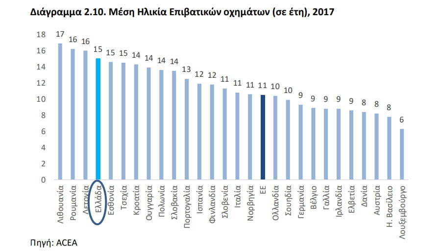 Σύμφωνα με την έρευνα του ΙΟΒΕ, πάνω από το 50% του στόλου αποτελείται από οχήματα από 10 έως 20 ετών, ενώ το 37% του στόλου είναι άνω των 19 ετών. Η κατάσταση αυτή δείχνει ότι είναι επιβεβλημένη η αλλαγή των οχημάτων, με νέα, πιο ασφαλή και «καθαρά». Η καθυστέρηση στην ανανέωση του στόλου οφείλεται τόσο στην καθιερωμένη πρακτική των καταναλωτών να διατηρούν επί μακρόν τα οχήματά τους, όσο και στην κρίση μετά το 2008 όπου δεν επέτρεψε σε μεγάλο μέρος του πληθυσμού την αγορά νέου οχήματος. Συγκρίνοντας με τις υπόλοιπες χώρες της ΕΕ28, προκύπτει ότι η Ελλάδα διαθέτει τον 4ο γηραιότερο στόλο επιβατικών.