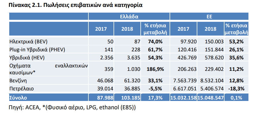 Η βασική αιτία του γερασμένου στόλου είναι ο χαμηλός ρυθμός εξόδου. Κατ’ επέκταση τα αυτοκίνητα παλαιάς τεχνολογίας που είναι και πιο ρυπογόνα σε σχέση με τα νεότερα, εξακολουθούν να χρησιμοποιούνται. Ο ελληνικός στόλος κυριαρχείται από βενζινοκίνητα επιβατικά (91%), από τα υψηλότερα ποσοστά στην ΕΕ, με χαμηλό μερίδιο στα πετρελαιοκίνητα, παρά την αύξησή τους μετά το 2011. Τα οχήματα εκτός βενζίνης και πετρελαίου αποκτούν σταδιακά ανιχνεύσιμο ποσοστό στο στόλο των κρατών της ΕΕ, ενώ στην Ελλάδα το μερίδιο στο στόλο παραμένει αρκετά χαμηλό.