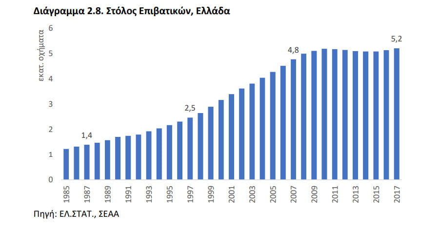 Ο στόλος επιβατικών παρουσιάζει αυξητική τάση από το 1985 μέχρι και το 2010, καθώς το 1985 τα επιβατικά Ιδιωτικής Χρήσεως (ΙΧ) ήταν 1,2 εκ. ενώ το 2010 ο στόλος προσέγγισε τα 5,2 εκ. οχήματα. Ανά δεκαετία, με έναρξη το 1987, η μεγαλύτερη αύξηση του στόλου οχημάτων σημειώθηκε μεταξύ 1997 και 2007, περίοδο κατά την οποία ο στόλος μεγεθύνθηκε κατά 2,3 εκ. επιβατικά λόγω των σημαντικών εισαγωγών καινούριων αλλά και μεταχειρισμένων επιβατικών.