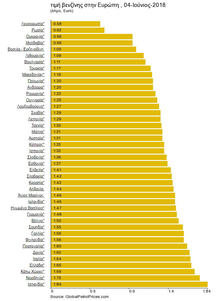Μεταξύ των Ευρωπαϊκών κρατών, η χώρα με τη χαμηλότερη τιμή στη βενζίνη είναι η Λευκορωσία με 0,58 ευρώ/λτ., ακολουθούμενη από την Ρωσία με τιμή 0,63 ευρώ/λτ. Στο αντίθετο άκρο με την πιο ακριβή βενζίνη τοποθετείται η Ισλανδία με 1,84 ευρώ/λτ., ενώ η Ελλάδα έχει την τέταρτη ακριβότερη βενζίνη στην Ευρώπη.