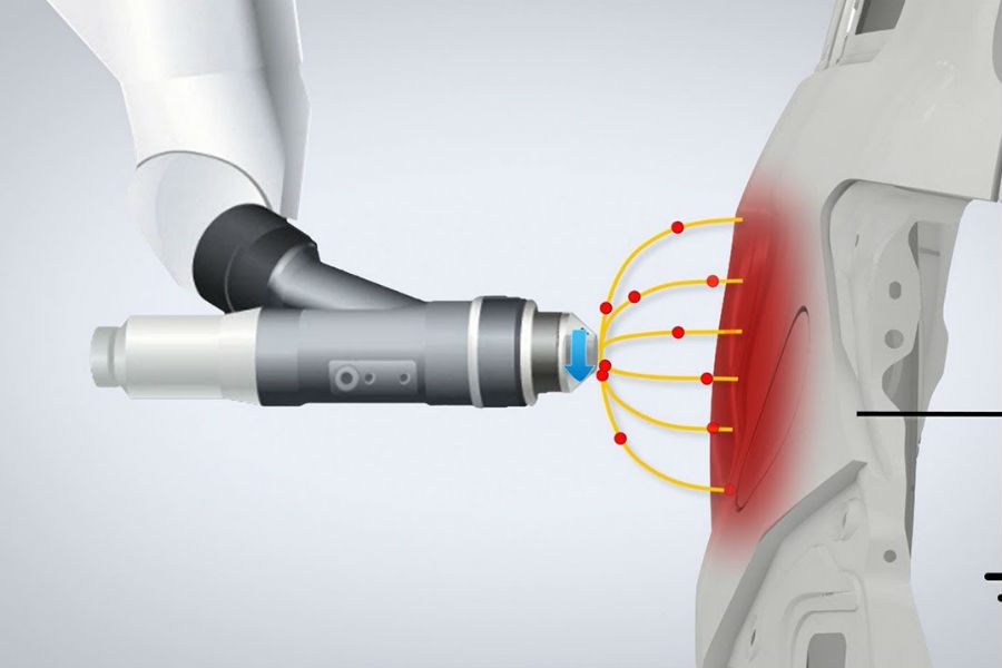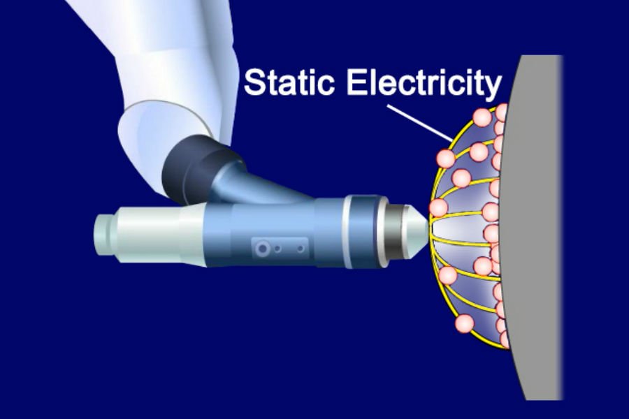 Επειδή, δε, οι επιφάνειες που πρέπει να καλυφθούν με χρώμα είναι ανομοιόμορφες (καμπύλες, γωνίες, αυξομειώσεις σε αποστάσεις κλπ στο αμάξωμα), υπάρχει ηλεκτρονικός έλεγχος που διατηρεί σταθερή απόσταση 10 εκατοστών μεταξύ ακροφυσίου και πάνελ, αυξομειώνοντας παράλληλα την τάση του ρεύματος ώστε να προσαρμόζεται στο εκάστοτε σημείο επαφής.