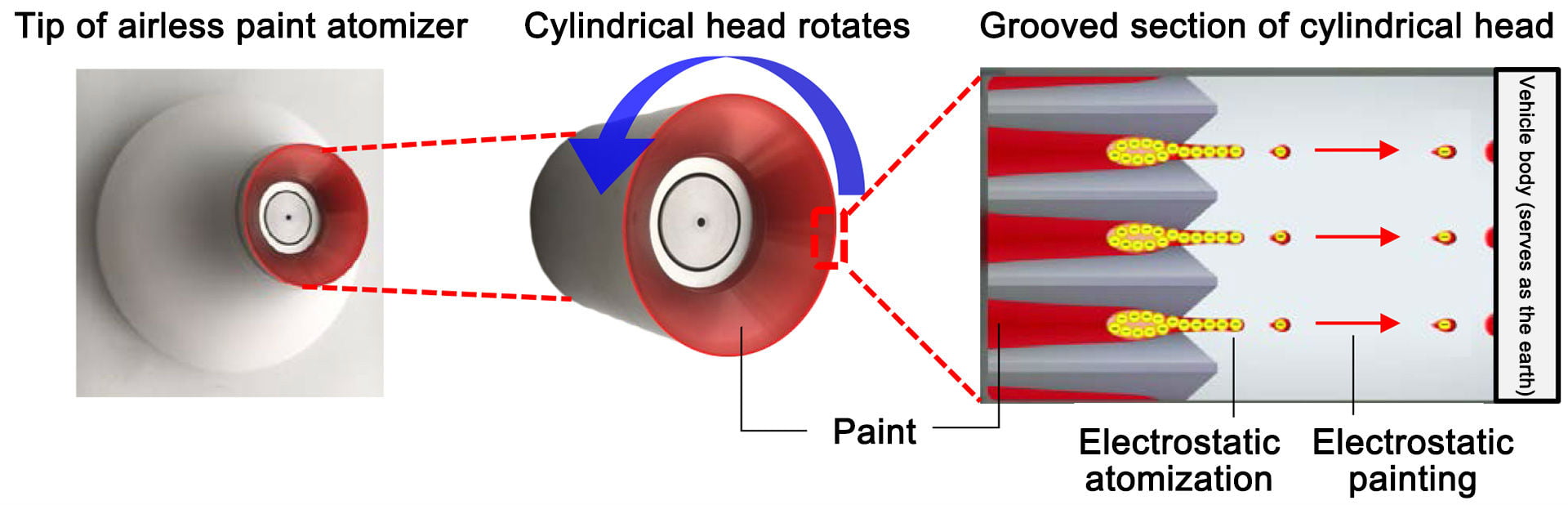 Με τη νέα ηλεκτροστατική μέθοδο, τα σωματίδια πρακτικά εκπέμπονται μέσω μιας περιστρεφόμενης κεφαλής 600 οπών εν είδει ακροφυσίου. Ο στατικός ηλεκτρισμός διατηρεί σταθερή την πορεία τους, ουσιαστικά στέλνοντάς τα συστημένα στα πάνελ μέσω της φυγόκεντρου. Για να το οπτικοποιήσετε καλύτερα, φανταστείτε τη διαφορά στον ψεκασμό νερού όταν αλλάζετε τις ρυθμίσεις στο «πιστόλι». Η βαφή, δηλαδή, πρακτικά εκτοξεύεται από το ακροφύσιο και κολλάει στην επιφάνεια μέσω του ηλεκτρισμού, αντί να αφήνεται να «κάτσει» μόνη της μετά τον ψεκασμό της παραδοσιακής μεθόδου.
