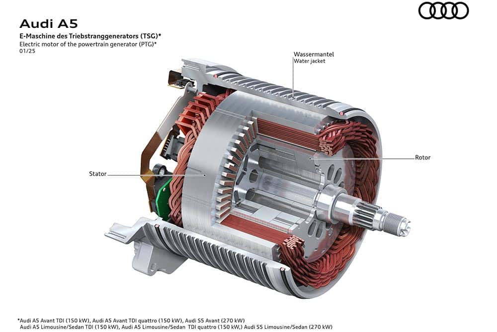 Η μικρή και ισχυρή ηλεκτρική μονάδα κίνησης στο νέο σύστημα MHEV plus είναι η γεννήτρια του συστήματος μετάδοσης κίνησης (PTG). Η PTG αποτελεί επίσης τη μεγαλύτερη διαφορά της MHEV plus σε σχέση με την προηγούμενη τεχνολογία MHEV που προσέφερε η Audi, η οποία λειτουργεί αποκλειστικά με έναν εναλλάκτη με ιμάντα εκκίνησης. Αυτή η μονάδα είναι τοποθετημένη στον άξονα εξόδου του κιβωτίου ταχυτήτων, παρέχει έως 18 kW (24 hp) ηλεκτρικής ισχύος και 230 Nm ροπής, βελτιώνοντας την επιτάχυνση και την απόδοση έως 140 χλμ./ώρα. Ζυγίζοντας περίπου 21 κιλά, η γεννήτρια μετάδοσης κίνησης (PTG) υποστηρίζει αναγεννητική πέδηση έως 25 kW, συμβάλλοντας στην ενεργειακή απόδοση. Τοποθετημένη πίσω από το κιβώτιο ταχυτήτων, λειτουργεί τόσο σε μπροστινή κίνηση όσο και σε τετρακίνηση.