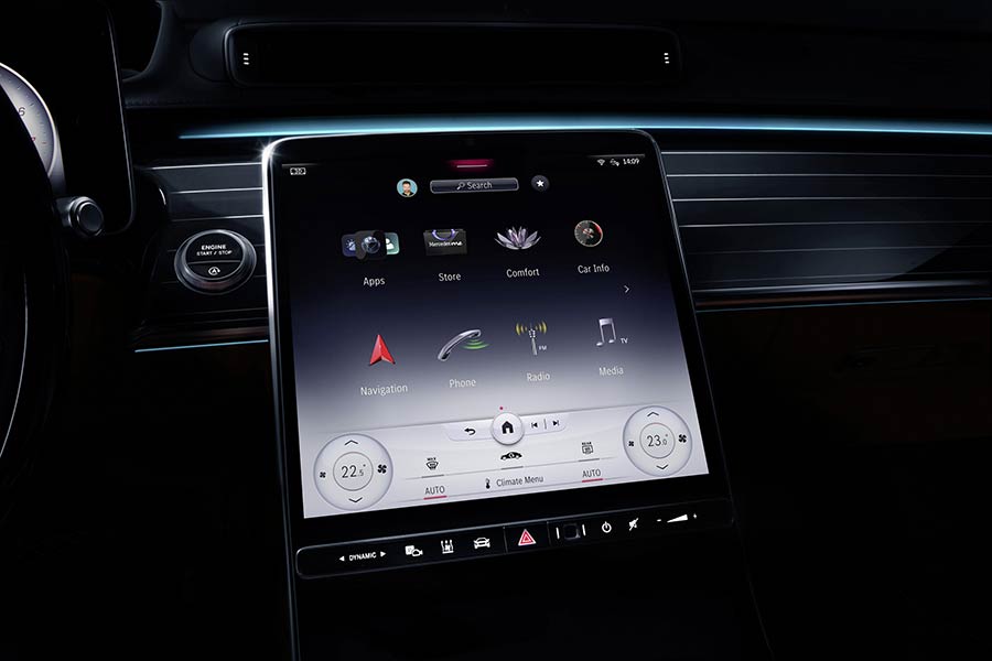 Τεχνολογία OLED: Η συντομογραφία σημαίνει Organic Light Emitting Diode, δηλαδή οργανική δίοδος εκπομπής φωτός. Σε αντίθεση με την τεχνολογία LCD, κάθε οθόνη OLED αποτελείται από αρκετά οργανικά στρώματα εκπομπής φωτός επάνω σε ένα πλαστικό υπόστρωμα. Στην S-Class, η οθόνη OLED τοποθετείται πίσω από γυάλινη πρόσοψη και, σε συνδυασμό με τους ενεργοποιητές και τους αισθητήρες πίεσης που βρίσκονται από πίσω, προσφέρει πλούσια εμπειρία χειρισμού και ενδείξεων. Η αξιολόγηση της ασκούμενης πίεσης και η επιβεβαίωση των εντολών αφής επιτρέπει ένα μεγάλο εύρος λειτουργιών. Οι OLED επιφάνειες εκπέμπουν φως όταν σε αυτές διοχετεύεται ηλεκτρικό ρεύμα, και αντίθετα με τις οθόνες LCD δεν χρειάζονται εξωτερικό οπίσθιο φωτισμό. Κατανάλωση ρεύματος γίνεται μόνο στα σημεία όπου πρέπει να φωτιστούν τα pixel, συνεπώς ένα από τα οφέλη είναι το καλύτερο επίπεδο μαύρου και η εντονότερη αντίθεση. Κατά τη συνήθη προβολή διαδοχικών εικόνων, η τεχνολογία OLED καταναλώνει έως και 30 % λιγότερη ενέργεια σε σύγκριση με την τεχνολογία LCD.