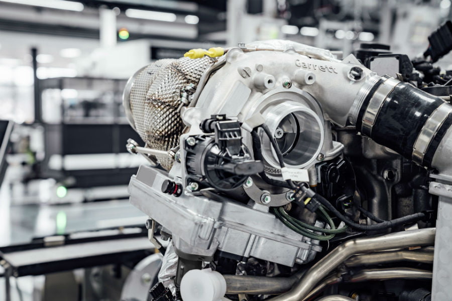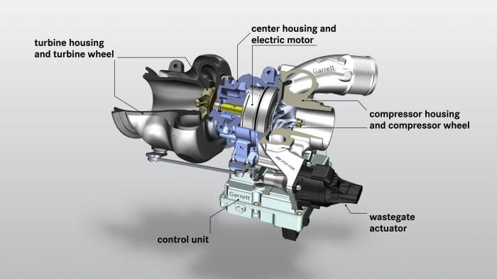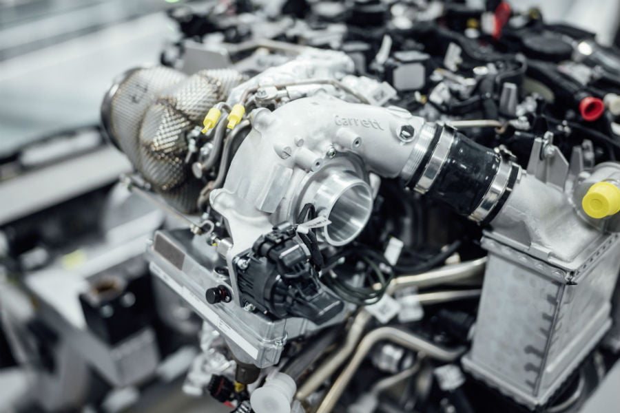 Ο ηλεκτρικός υπερσυμπιεστής εξελίσσεται σε συνεργασία με την πασίγνωστη Garrett και αντλεί έμπνευση από τα αντίστοιχα της Formula 1, συνδυάζοντας την αμεσότητα ενός μικρού τούρμπο με την υπερπλήρωση ενός μεγάλου. Ένας ηλεκτροκινητήρας μεγέθους 4 εκατοστών βρίσκεται ενσωματωμένος στον άξονα του συμπιεστή και παίρνει ενέργεια από ένα σύστημα 48 Volt. Όταν δεν υπάρχει επαρκής ροή καυσαερίων (στις χαμηλές στροφές, δηλαδή), ο ηλεκτροκινητήρας περιστρέφει τον άξονα δίνοντάς του ώθηση μέχρι να αναλάβουν τα καυσαέρια. Η λειτουργία του, θα λέγαμε πως προσομοιώνει αυτή των σειριακών τούρμπο, όπου το μικρό λειτουργεί στις χαμηλές στροφές και στη συνέχεια δίνει τη θέση του στο μεγάλο.