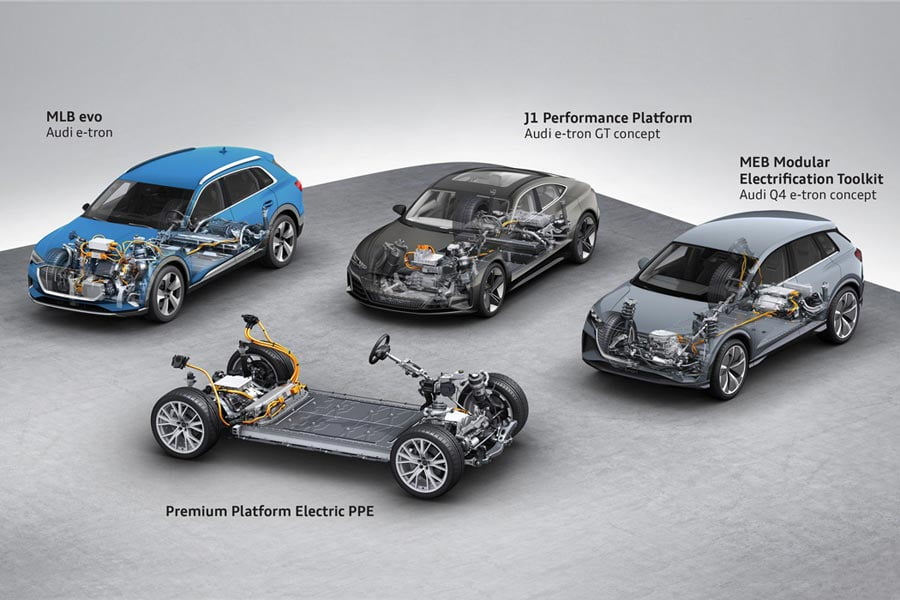 Το e-tron αποτελεί το πρώτο μεγάλο SUV μοντέλο της βασισμένο στην πλατφόρμα MLB (modular longitudinal platform) και το 4θυρο Gran Turismo e-tron GT concept βασίζεται στην πλατφόρμα J1 Performance Platform της Porsche. Τα πιο κόμπακτ ηλεκτρικά Audi θα βασίζονται στη γνωστή από το VW ID.3 πλατφόρμα MEB (modular electrification platform), ενώ τα μεγάλα ηλεκτρικά θα χρησιμοποιούν τη νέα πλατφόρμα PPE (Premium Platform Electric).