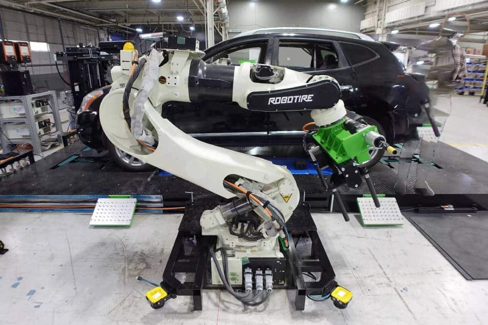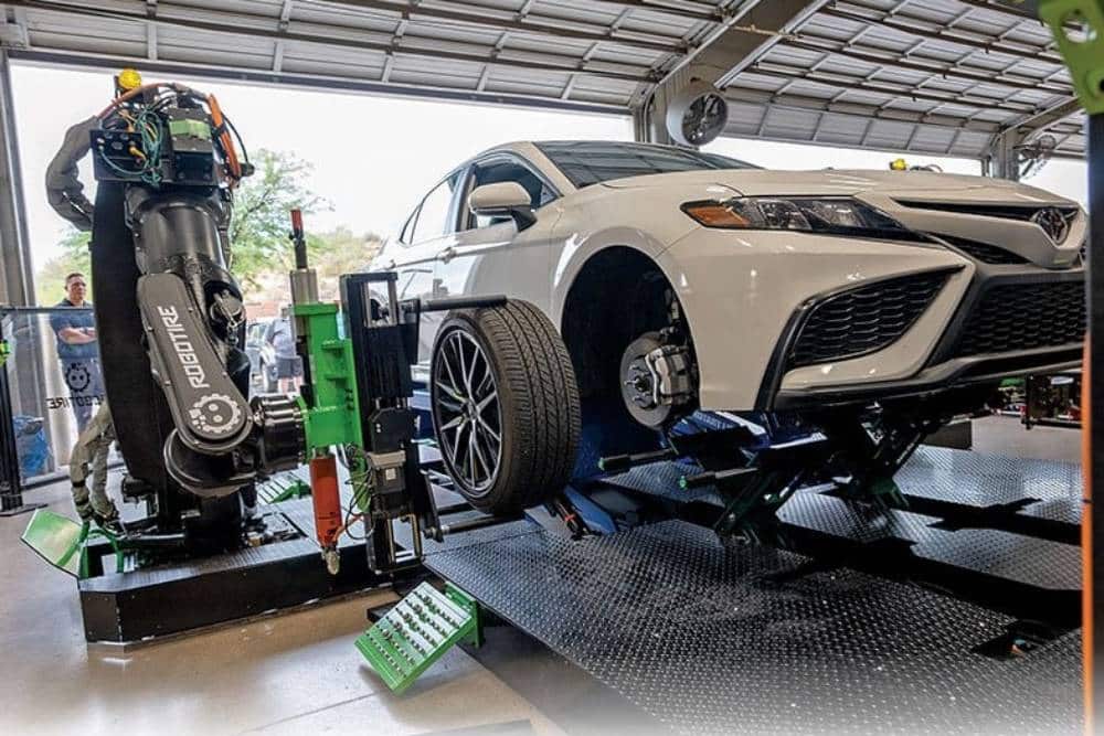 Το RoboTire είναι ακριβώς αυτό που λέει το όνομά του: ένας ρομποτικός μηχανισμός, ειδικά σχεδιασμένος για να αντικαθιστά ελαστικά οχημάτων. Χρησιμοποιεί 6 διπλούς βραχίονες (3 ανά πλευρά), πανομοιότυπους με εκείνους που χρησιμοποιούνται στις γραμμές παραγωγής των αυτοκινητοβιομηχανιών. Το αυτοκίνητο τοποθετείται στο αναβατόριο και από εκεί, αναλαμβάνει η τεχνητή νοημοσύνη. Κάμερες σκανάρουν το όχημα, εντοπίζοντας τη θέση του τροχού, τον αριθμό των μπουλονιών και τον τύπο τους. Το RoboTire εν συνεχεία ξεσφίγγει ένα-ένα τα παξιμάδια, αφαιρεί τη ρόδα και τοποθετεί τον καινούργιο τροχό, ή τον ίδιο με νέο λάστιχο.