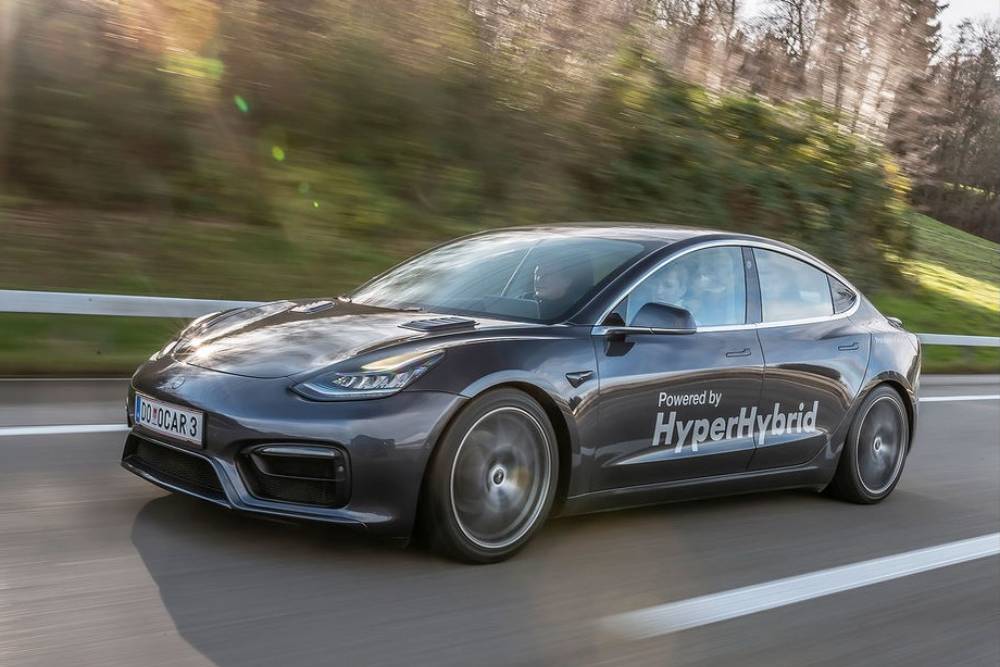 Η αυστριακή Obrist δημιούργησε ένα μοναδικό Model 3, που έχει κάτω από το καπό έναν λιλιπούτειο δικύλινδρο βενζινοκινητήρα 999 κ.εκ. να λειτουργεί ως range extender. Στο πίσω μέρος, κάτω από το δάπεδο του πορτμπαγκάζ, υπάρχει ένα ρεζερβουάρ 30 λίτρων. Η μπαταρία είναι μικρότερη, στις 17,3 kWh αντί των 75 kWh του εργοστασίου, όμως ο συνδυασμός της με τον βενζινοκινητήρα εμφανίζεται ευεργετικός. Σύμφωνα με τους δημιουργούς του HyperHybrid, όπως ονομάζεται το πρωτότυπο Tesla, λόγω της μικρότερης μπαταρίας το βάρος μειώνεται κατά 285 κιλά!