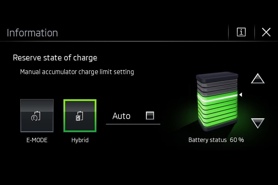 Ο οδηγός έχει να επιλέξει μεταξύ δύο βασικών λειτουργιών οδήγησης: Της ηλεκτρικής και της υβριδικής. Στην πρώτη περίπτωση λειτουργεί μόνο το ηλεκτρικό μοτέρ, ενώ στη δεύτερη περίπτωση η ίδια η μονάδα ελέγχου αξιολογεί πολλούς διαφορετικούς παράγοντες και επιλέγει τον ένα, τον άλλο ή και τους δύο κινητήρες. Σε κάθε περίπτωση ο οδηγός πληροφορείται μέσω ενδείξεων στον πίνακα οργάνων.