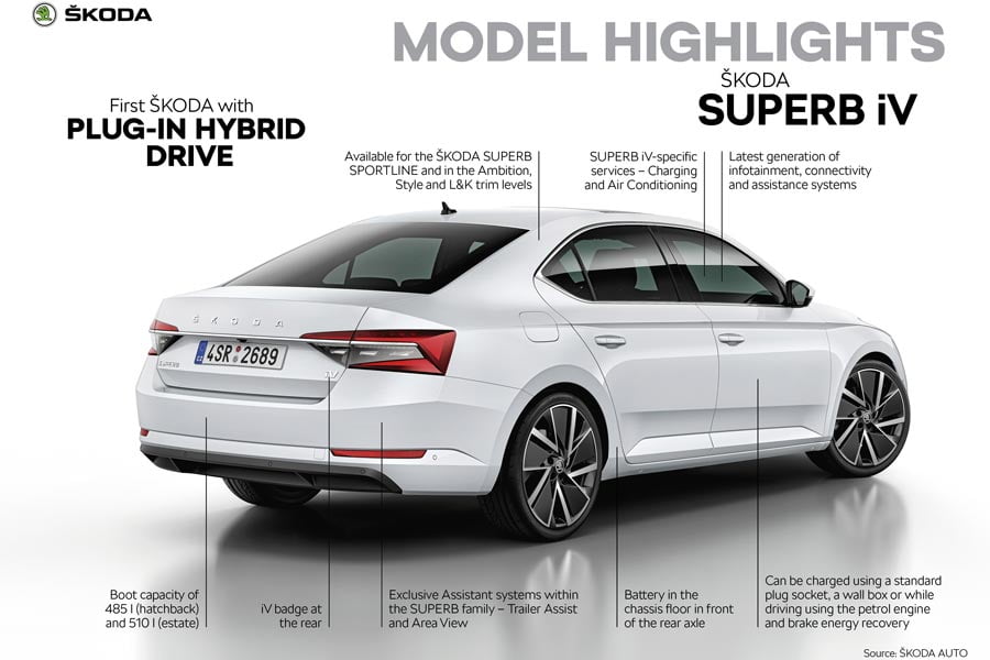 Το ανανεωμένο Skoda Superb που έκανε πρεμιέρα πριν από λίγες μέρες, είναι και το πρώτο μοντέλο της Skoda με plug-in υβριδική τεχνολογία. Το Superb iV θα είναι διαθέσιμο στις εκδόσεις εξοπλισμού Ambition και Style καθώς και στις Superb Sportline και Superb L&K. Η παραγωγή θα ξεκινήσει το Φθινόπωρο, ενώ το λανσάρισμα είναι προγραμματισμένο για τις αρχές του 2020, όταν αναμένεται και στην Ελλάδα.