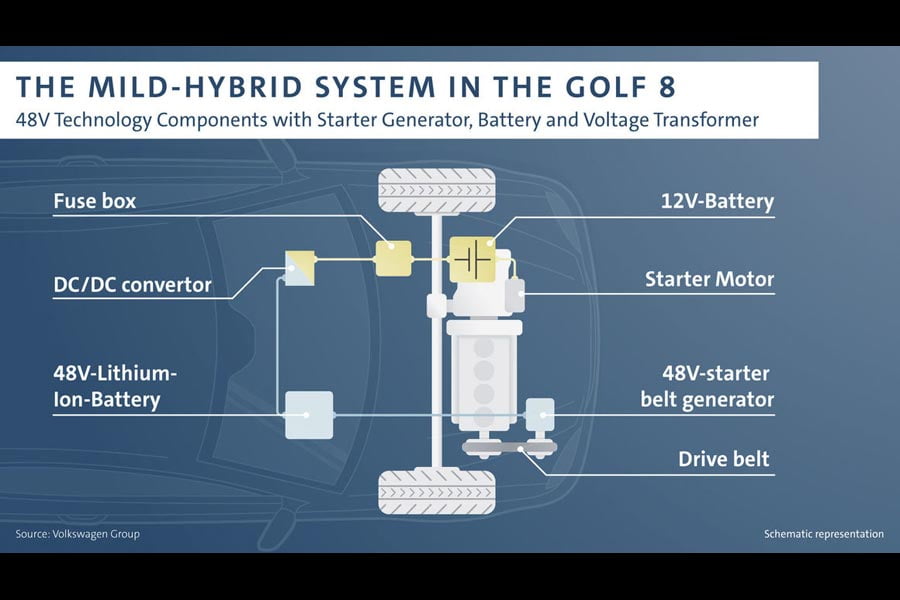 Το νέο, όγδοης γενιάς VW Golf θα εφοδιάζεται με ένα νέο ήπιο υβριδικό σύστημα με τεχνολογία 48 volt, η οποία δεν είναι πολυσύνθετη και αποτελείται από τρία βασικά τμήματα: Την 48V γεννήτρια εκκίνησης με ιμάντα που βρίσκεται δίπλα από τον κινητήρα, τη μπαταρία ιόντων λιθίου 48V και το μετατροπέα DC/DC που τροφοδοτεί το συμβατικό σύστημα των 12V. Το 48V υβριδικό σύστημα θα είναι διαθέσιμο αρχικά με τους TSI κινητήρες του 1.0 λτ. και των 1.5 λτ. και με το DSG κιβώτιο ταχυτήτων, ενώ αργότερα θα επεκταθεί σε άλλα μηχανικά σύνολα.