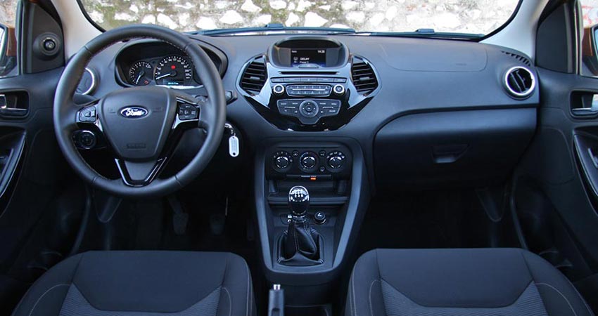 Το εσωτερικό του νέου Ford Ka+ δεν διεκδικεί κάποιο βραβείο πρωτότυπης σχεδίασης, αφού οι δημιουργοί του επέλεξαν να δώσουν βάση σε στοιχεία όπως η εργονομία, η λειτουργικότητα ή η πρακτικότητα του θαλάμου, και όχι στον εντυπωσιασμό της εικόνας. Έτσι, οι γραμμές ακολουθούν το δρόμο της απλότητας, με στοιχεία στο εσωτερικό που παραπέμπουν στο αντίστοιχο τμήμα του Fiesta (τιμόνι, οθόνη συστήματος infotainment), αλλά και εύκολα προσβάσιμους διακόπτες και χειριστήρια. Στο ίδιο μήκος κύματος έρχεται και η πολύ καλή πρακτικότητα, όπως αυτή εκφράζεται από τις συνολικά 21 διαφορετικές θήκες για μικροαντικείμενα που υπάρχουν στο εσωτερικό (highlight η «κρυμμένη» από την πόρτα θήκη στα αριστερά του ταμπλό). Ποιοτικά, τα υλικά που έχουν χρησιμοποιηθεί για να ντύσουν όλες τις επιφάνειες δεν είναι πρώτης γραμμής ως προς την απτή τους ποιότητα, ενώ απουσιάζουν πλήρως τα μαλακά πλαστικά, ωστόσο η συναρμογή τους είναι στιβαρή και δείχνει ότι θα αντέξει στο πέρασμα του χρόνου.