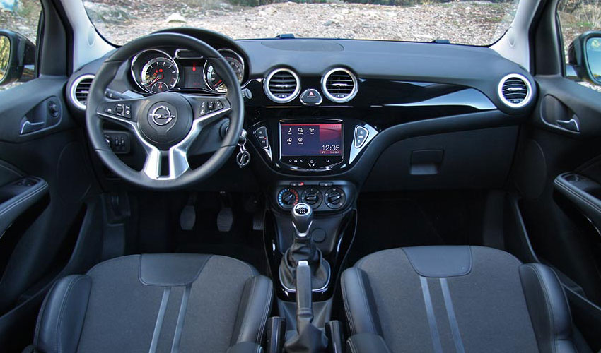 Όπως το αμάξωμα, έτσι και το εσωτερικό του ADAM διαθέτει όμορφο σχεδιασμό με σπορτίφ χαρακτηριστικά, τα οποία τονίζονται και από τα εμπρός καθίσματα με την ενισχυμένη πλευρική στήριξη. Την ποιότητά του αναβαθμίζουν η χρήση μαλακού πλαστικού στο ταμπλό και το προσεγμένο φινίρισμα, αν και στο αυτοκίνητο της δοκιμής ακούγονταν τριγμοί από τις πόρτες. Βασικό του μειονέκτημα αποτελούν οι περιορισμένοι χώροι για τους πίσω επιβάτες σε συνδυασμό με την κάθετη θέση της πλάτης του πίσω καθίσματος που κουράζουν, καθώς και το μικρό σε άνοιγμα και χωρητικότητα πορτ μπαγκάζ των 170 λίτρων.