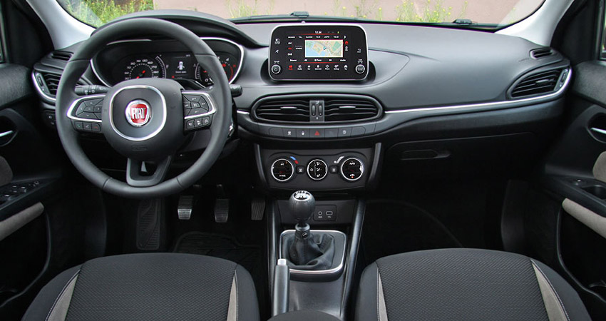 Στο θάλαμο των επιβατών του Tipo Hatchback ξεχωρίζει σε σχέση με το αντίστοιχο τμήμα του σεντάν μοντέλου η παρουσία της οθόνης αφής των 7 ιντσών του συστήματος πολυμέσων U-Connect στο πάνω μέρος της κεντρικής κονσόλας (στάνταρ στην πιο πλούσια έκδοση Lounge), που τονίζει τον high-tech χαρακτήρα του αυτοκινήτου. Από εκεί και πέρα οι γραμμές του ταμπλό είναι σύγχρονες, ο πίνακας οργάνων είναι υπέρ-πλήρης, ενώ και το τιμόνι προέρχεται από άλλα μοντέλα της Fiat (π.χ. 500Χ). Ποιοτικά, το εσωτερικό του 5θυρου Tipo διαθέτει μαλακά πλαστικά πάνω στο ταμπλό και σκληρά στις περισσότερες από τις υπόλοιπες επιφάνειες, με τα δεύτερα να μην ικανοποιούν με την υφή και το φινίρισμά τους. Τουλάχιστον η συνολική συναρμογή στο αυτοκίνητο της δοκιμής έδειξε αρκετά στιβαρή. Από την άλλη, εκεί όπου το Tipo κερδίζει τις εντυπώσεις είναι στο πεδίο της πρακτικότητας, αφού 4 ενήλικες θα μεταφερθούν χωρίς κανένα πρόβλημα στο εσωτερικό του, ενώ το πορτ-μπαγκάζ με τα 440 λίτρα χωρητικότητας είναι απλά το μεγαλύτερο σε μικρομεσαίο χάτσμπακ μοντέλο.