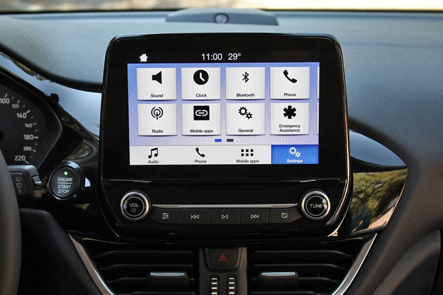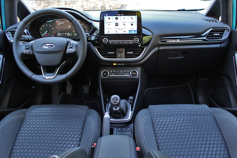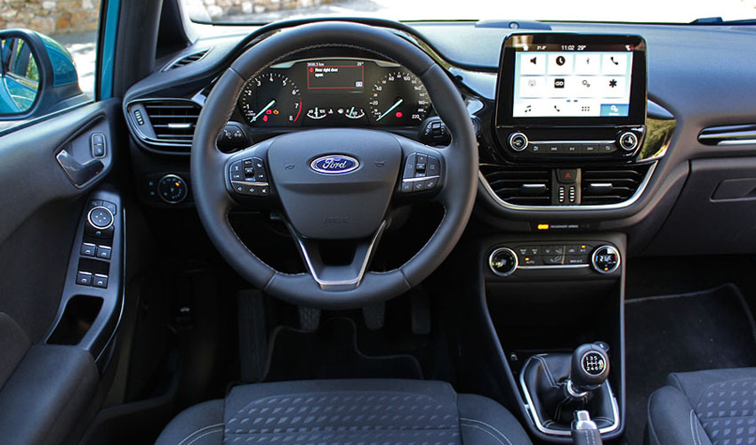 Πλήρως ανασχεδιασμένο όμως είναι και το εσωτερικό του νέου Ford Fiesta. Η εργονομία του είναι αισθητά βελτιωμένη και αγγίζει το τέλειο. Η μεγάλη οθόνη αφής 8,0 ιντσών παραπέμπει σε τάμπλετ, είναι ευκρινής και άμεση. Υπάρχουν διακόπτες με άμεση πρόσβαση για κλιματισμό, σύστημα Start/Stop και ηλεκτρονικό σύστημα ελέγχου της ευστάθειας, που σημαίνει πως δεν χρειάζεται να περιηγηθείς σε κάποιο μενού για βασικές λειτουργίες του αυτοκινήτου. Μοναδικές παραφωνίες οι εξωτερικοί καθρέφτες οι οποίοι θα μπορούσαν να είναι μεγαλύτεροι και ο διακόπτης για την ενεργοποίηση του πίσω υαλοκαθαριστήρα, ο οποίος είναι στην άκρη του μοχλού υαλοκαθαριστήρων και μπορεί να ενεργοποιηθεί κατά λάθος. Σχεδιαστικά, στο ταμπλό με τις απαλές καμπύλες κυριαρχεί η μεγάλη οθόνη αφής του συστήματος πολυμέσων SYNC3 (4,2 ιντσών στην έκδοση Trend και 6,5 ιντσών στην Business), στην οποία έχουν ενσωματωθεί διάφορες λειτουργίες του αυτοκινήτου, ενώ έτσι μειώθηκαν κατά 50% οι διακόπτες. Νέο στοιχείο αποτελεί και το υψηλής απόδοσης ηχοσύστημα B&O Play της Bang & Olufsen, με απόδοση 675 watt, 10 ηχεία και subwoofer.