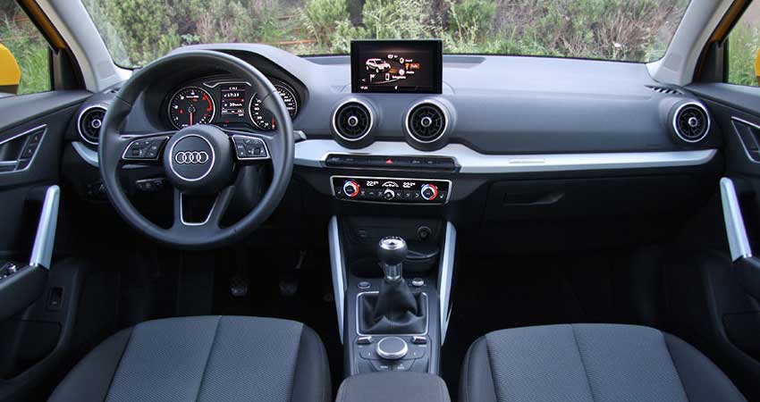 Το εσωτερικό του Audi Q2 θυμίζει εν πολλοίς αυτό του A3. Ποιοτικό, καλοφτιαγμένο και με προσοχή στην λεπτομέρεια, δεν αφήνει περιθώρια για παράπονα. Το ταμπλό είναι φτιαγμένο από μαλακό υλικό, ενώ ακόμη και τα σκληρά υλικά είναι ευχάριστα στην υφή και στην όψη. Ο πίνακας οργάνων είναι ευανάγνωστος και τυπικός σε εμφάνιση για μοντέλο Audi, με δύο μεγάλα κυκλικά όργανα (ταχύμετρο και στροφόμετρο) να κυριαρχούν. Την παράσταση πάντως κλέβει το τριάκτινο δερμάτινο τιμόνι με τα χειριστήρια αλλά και η έγχρωμη οθόνη του συστήματος πολυμέσων MMI, στο κέντρο του ταμπλό (αναδυόμενη).