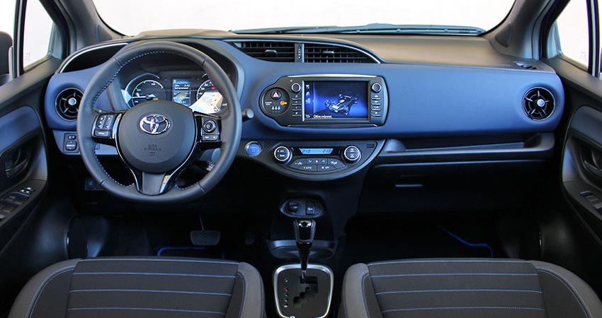 Οι αλλαγές στο εσωτερικό του νέου Toyota Yaris και φυσικά του Hybrid που δοκιμάζουμε εδώ δεν είναι το ίδιο αισθητές με αυτές του αμαξώματος. Ο σχεδιασμός του ταμπλό και τη κονσόλας παραμένει ως έχει. Η εντονότερη αλλαγή είναι ο πίνακας οργάνων ο οποίος πλέον έχει δύο κυκλικά όργανα δεξιά και αριστερά στα άκρα του (το ένα ταχύμετρο το άλλο μετρητής ενέργειας). Αλλαγμένοι είναι και οι κυκλικοί αεραγωγοί εμπρός και κάποια από τα χειριστήρια στο τιμόνι αλλά και οι επενδύσεις σαλονιού. Από την άλλη το σύστημα πολυμέσων παραμένει ως έχει, ενώ το ίδιο ισχύει και για τα πάνελ των θυρών.