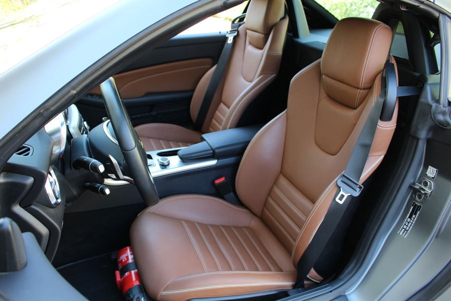 Στην καμπίνα των επιβατών, η αποκλειστικά διθέσια Mercedes SLC διατηρεί ένα πολύ ποιοτικό εσωτερικό, με υλικά ανώτερης ποιότητας που πείθουν απόλυτα με τη συναρμογή τους. Σχεδιαστικά, οι αλλαγές σε σχέση με την τελευταία SLK εντοπίζονται στο πιο σπορτίφ τριάκτινο τιμόνι με επίπεδο κάτω τμήμα, τα νέα σχεδίασης καθίσματα (με πανέμορφα καφέ δέρματα στο μοντέλο της δοκιμής), αλλά και στη μεγαλύτερη (7 ιντσών) οθόνη για το σύστημα πολυμέσων μέσα στην κεντρική κονσόλα. Ο οδηγός, κάθεται σχετικά χαμηλά και δεν έχει πρόβλημα με το διαθέσιμο ύψος, όντας παράλληλα σε θέση να βρει εύκολα την επιθυμητή θέση οδήγησης. Ευχάριστο στοιχείο αποτελεί ότι λόγω και της θέσεως του χειρόφρενου, κλασικά στα αριστερά και εμπρός του οδηγού, υπάρχουν αρκετές θήκες για μικροαντικείμενα στο τούνελ της κονσόλας που προάγουν την πρακτικότητα. Το πορτ-μπαγκάζ, με 330 λτ. χωρητικότητας όταν η οροφή είναι κλειστή είναι επιπλέον από τα μεγαλύτερα της κατηγορίας (225 λτ. με την οροφή ανοικτή).