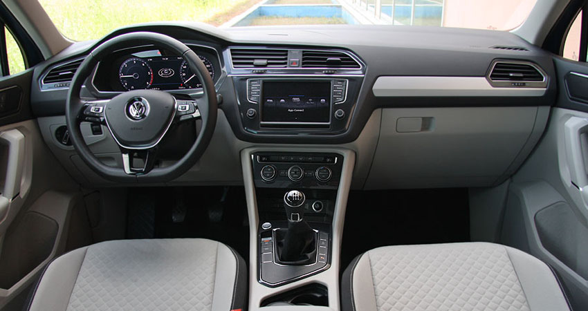 Η καμπίνα του νέου Tiguan κερδίζει τις πρώτες εντυπώσεις με την πολύ καλή ποιότητα κατασκευής του, αφού είναι προσεγμένη τόσο σε υλικά όσο και σε φινίρισμα και συναρμογή των επιμέρους επιφανειών. Το πάνω μέρος του ταμπλό είναι κατασκευασμένο από μαλακό, αφρώδες πλαστικό, ενώ και τα σκληρά πλαστικά έχουν πολύ καλή υφή και είναι συμπαγή. Σχεδιαστικά, το εσωτερικό του Tiguan με τις λιτές και καθαρές γραμμές του δεν έχει κάποιο ιδιαίτερο ενδιαφέρον, ωστόσο από την άλλη πλευρά η πολύ καλή εργονομία και θέση οδήγησης θα εκτιμηθούν αμέσως από τον οδηγό. Άριστα παίρνει το εσωτερικό του νέου Tiguan και σε πρακτικότητα, αφού είναι σε θέση να φιλοξενήσει χωρίς πρόβλημα 5 ενήλικες επιβάτες, οι οποίοι έχουν στη διάθεσή τους από 420 λτ. έως 615 λτ. για τις αποσκευές, ανάλογα τη θέση του πίσω στάνταρ διαιρούμενου και συρόμενου κατά 16 εκατοστά πίσω καθίσματος.