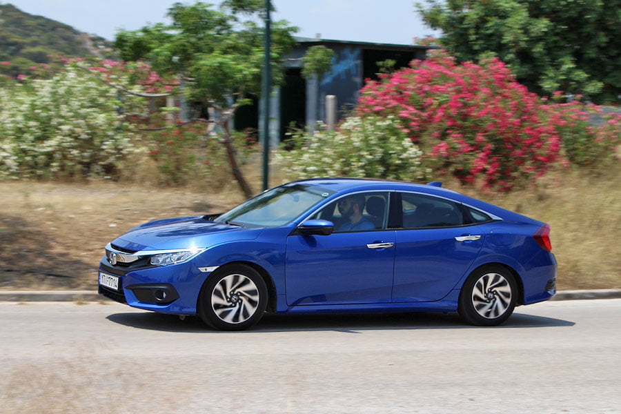 Οι ανεξάρτητες αναρτήσεις του καταφέρνουν και απορροφούν με επιτυχία τις διάφορες ανωμαλίες των δρόμων, κρατώντας -σε συνδυασμό με τα αναπαυτικά καθίσματα- ξεκούραστους τους επιβάτες στις πολύωρες μετακινήσεις. Το Civic Sedan κινείται με απόλυτη σιγουριά στις ευθείες και καμπές των εθνικών οδών ακόμα και σε πάρα πολύ γρήγορες ταχύτητες, τις οποίες φτάνει εύκολα και δεν αντιλαμβάνονται οι επιβάτες του. Το ίδιο ισχύει και σε πιο σφιχτές διαδρομές με στροφές, όπου το μοντέλο της Honda καταφέρνει να κρύβει το μέγεθός του, ακολουθώντας ευλαβικά τις εντολές του οδηγού. Λίγη περισσότερη προσοχή θα θέλαμε από τους Ιάπωνες στο θόρυβο κύλισης.