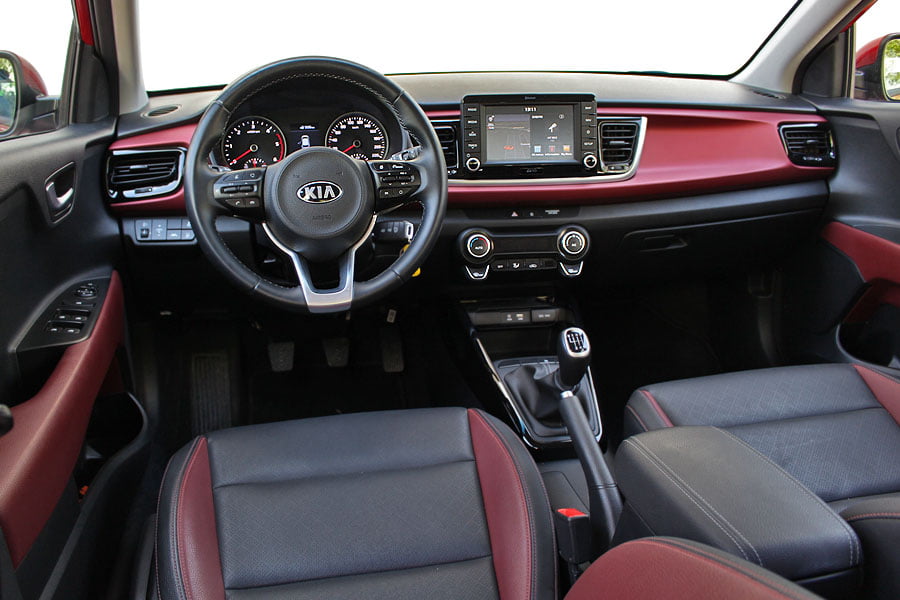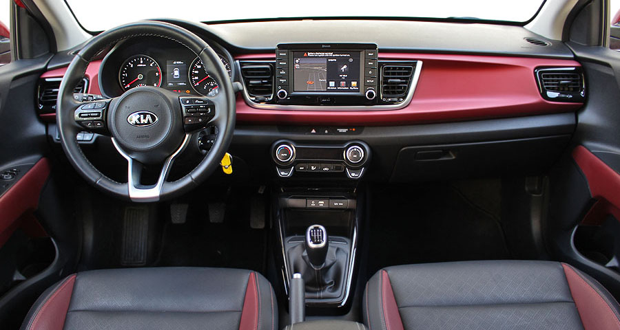 Το εσωτερικό του νέου Kia Rio δεν σε αφήνει ασυγκίνητο. Βλέπεις είναι η φάσα με την διχρωμία που κάνει τα πράγματα πιο ευχάριστα, η στάνταρ οθόνη αφής 7 ιντσών του συστήματος πολυμέσων στο κέντρο του ταμπλό και το ωραίο τιμόνι με τα χειριστήρια που φροντίζουν για μια καλή πρώτη εντύπωση. Κάτι που συνεχίζεται μόλις κάτσεις και βολευτείς στη θέση του οδηγού με τις πολλές και με μεγάλο εύρος ρυθμίσεις και κοιτάξεις τον ευανάγνωστο πίνακα οργάνων με την μεγάλη ψηφιακή οθόνη για τον υπολογιστή ταξιδιού. Τα υλικά που έχουν χρησιμοποιηθεί είναι εξαιρετικά σε όψη, αν και σκληρά στην πλειοψηφία τους, η συναρμογή τους όμως είναι προσεγμένη και η συναρμολόγησή τους πείθει πως δεν αποτελέσουν εστία τριγμού σε βάθος χρόνου. Στα θετικά συγκαταλέγεται και το σύστημα κλιματισμού, με δύο περιστροφικούς και τέσσερεις αεροπορικού τύπου διακόπτες. Οι χώροι για τους επιβάτες ικανοποιούν και με το παραπάνω καθώς μπορούν να μεταφερθούν χωρίς πρόβλημα τέσσερις ενήλικες αναστήματος άνω του μετρίου, ενώ ο χώρος αποσκευών είναι στα 325 λίτρα (985 με αναδίπλωση της πλάτης των πίσω καθισμάτων).