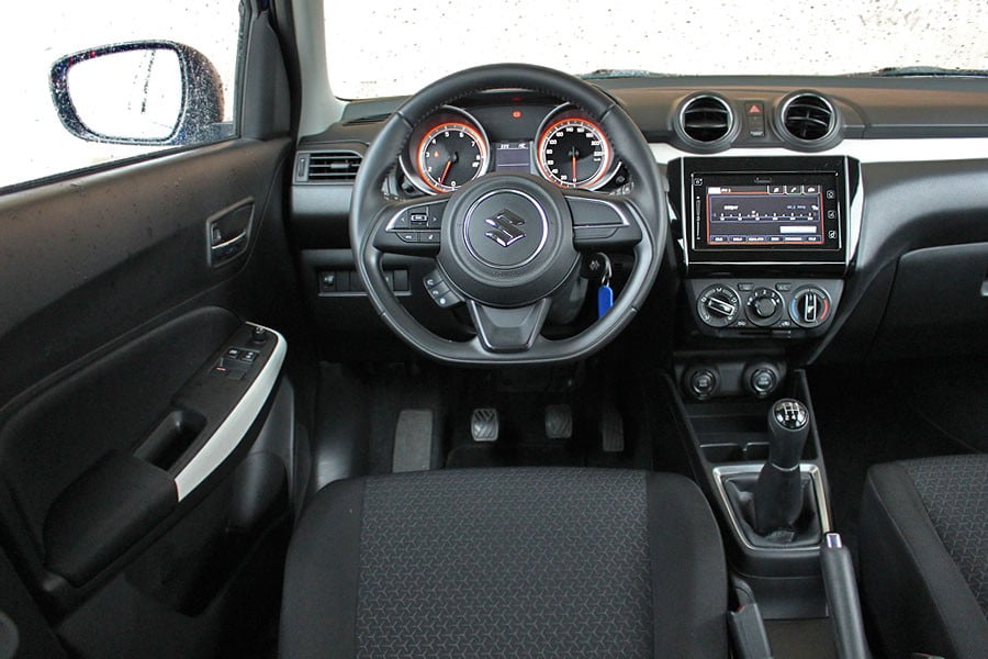 Στο πλήρως ανασχεδιασμένο εσωτερικό του νέου Swift η συνολική εικόνα έχει νεανικά και σπορτίφ χαρακτηριστικά. Κυρίαρχα στοιχεία είναι ο πίνακας οργάνων με τα δύο μεγάλα στρογγυλά όργανα του στροφόμετρου και ταχύμετρου, η ψηφιακή οθόνη των 4,2 ιντσών που βρίσκεται ανάμεσά τους, το σύστημα πολυμέσων με την οθόνη αφής των 7,0 ιντσών και το μικρής διαμέτρου επίπεδο στο κάτω μέρος τιμόνι. Από πλευράς κατασκευής δεν εντυπωσιάζει μέσω της ευρείας χρήσης σκληρών πλαστικών με ατέλειες στη συναρμογή και στο φινίρισμα. Ο οδηγός δεν θα αντιμετωπίσει κάποιο πρόβλημα με την εργονομία των διαφόρων χειριστηρίων, ωστόσο βασική έλλειψη είναι απουσία ρύθμισης του τιμονιού μέσα – έξω. Οι χώροι που προσφέρει το εσωτερικό του νέου Swift είναι καλοί για τις μετακινήσεις 4 ατόμων, ωστόσο παρά την αύξηση κατά 54 λίτρα του χώρου αποσκευών, τα 265 λίτρα το τοποθετούν πιο κάτω από άλλα μικρά αυτοκίνητα.