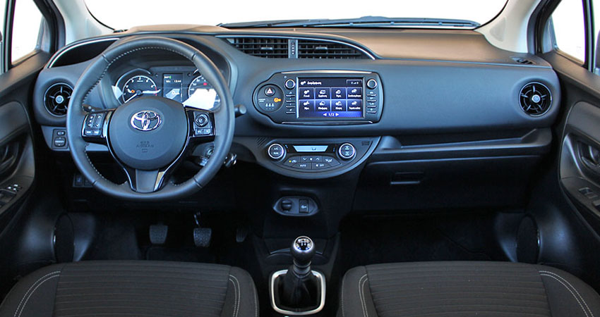 Βελτιώσεις έγιναν και στο θάλαμο των επιβατών του ανανεωμένου Toyota Yaris, χαρίζοντάς του πιο σύγχρονη εικόνα και καλύτερη ποιότητα. Οι αλλαγές αφορούν τις νέες επενδύσεις, τη νέα σχεδίαση των αεραγωγών, τα νέα διακοσμητικά λάκας πιάνου στο τιμόνι και το νέο πίνακα οργάνων με οθόνη TFT 4,2 ιντσών (εκτός της αρχικής έκδοσης). Αναβαθμισμένο είναι με την σειρά του και το σύστημα πολυμέσων Toyota Touch 2, οι λειτουργίες του οποίου χειρίζονται μέσω της κεντρικά τοποθετημένης οθόνης αφής των 7 ιντσών (στάνταρ από την έκδοση Activeκαι άνω). Από πλευράς κατασκευής, έχει γίνει χρήση κυρίως σκληρών πλαστικών, ενώ το μαλακό υλικό που συναντάται στο εμπρός μέρος του ταμπλό και στις επενδύσεις των θυρών το αναβαθμίζει. Το φινίρισμα και η συναρμογή βρίσκονται σε καλά επίπεδα, αν και δεν λείπουν ορισμένες μικροατέλειες. Ο οδηγός δεν θα αντιμετωπίσει κάποιο ουσιαστικό πρόβλημα με την εργονομία, ωστόσο το τιμόνι παρόλο που διαθέτει ρυθμίσεις προς όλες τις κατευθύνσεις είναι χαμηλά τοποθετημένο. Στον τομέα των χώρων, το Yaris τα καταφέρνει πολύ καλά, αφού είναι σε θέση να φιλοξενήσει χωρίς παραχωρήσεις τέσσερα ενήλικα άτομα. Το πορτ μπαγκάζ με τα 279 λίτρα είναι ικανοποιητικό, ωστόσο ο ανταγωνισμός έχει ανεβάσει τον πήχη πολύ πιο πάνω από τα 300 λίτρα.