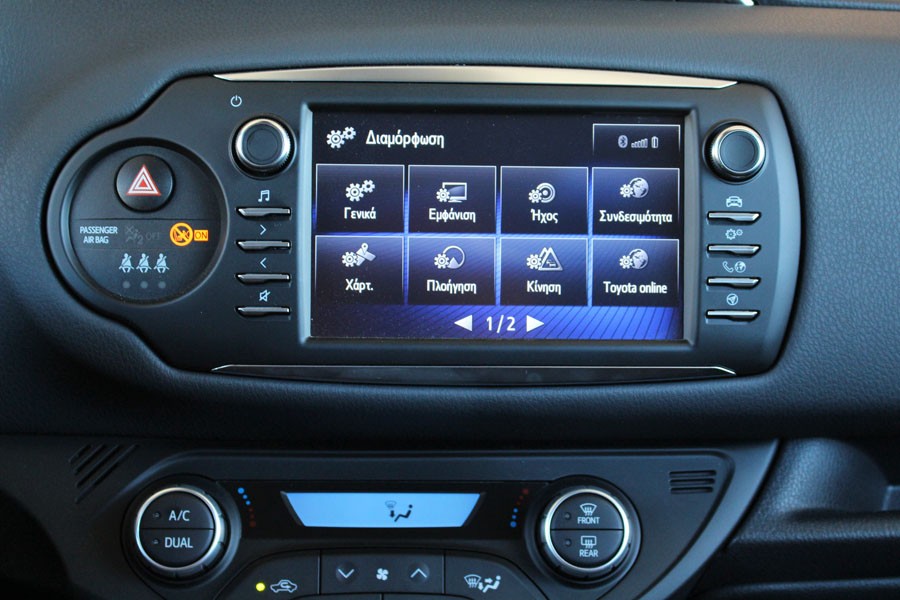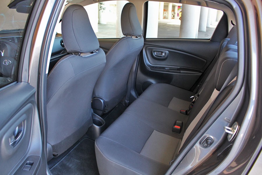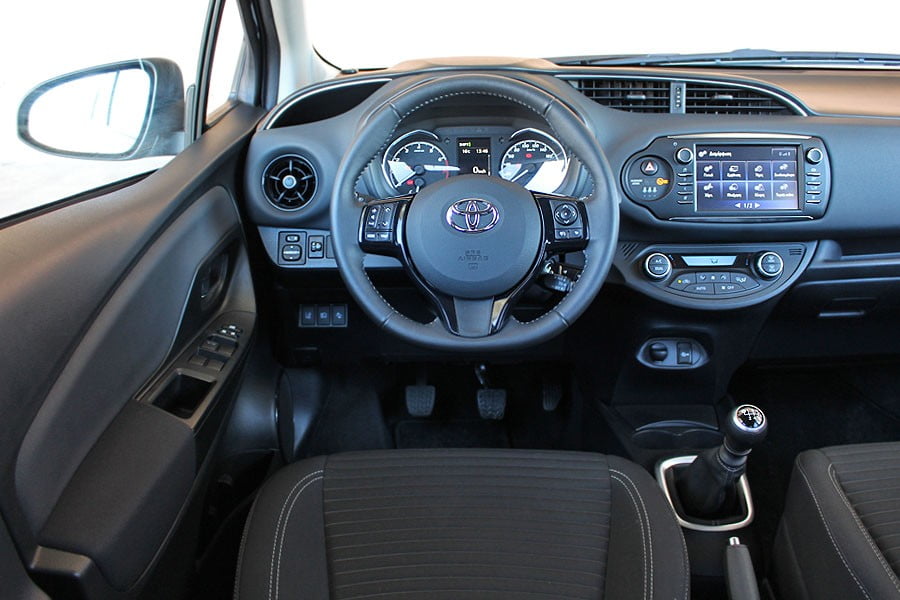 Βελτιώσεις έγιναν και στο θάλαμο των επιβατών του ανανεωμένου Toyota Yaris, χαρίζοντάς του πιο σύγχρονη εικόνα και καλύτερη ποιότητα. Οι αλλαγές αφορούν τις νέες επενδύσεις, τη νέα σχεδίαση των αεραγωγών, τα νέα διακοσμητικά λάκας πιάνου στο τιμόνι και το νέο πίνακα οργάνων με οθόνη TFT 4,2 ιντσών (εκτός της αρχικής έκδοσης). Αναβαθμισμένο είναι με την σειρά του και το σύστημα πολυμέσων Toyota Touch 2, οι λειτουργίες του οποίου χειρίζονται μέσω της κεντρικά τοποθετημένης οθόνης αφής των 7 ιντσών (στάνταρ από την έκδοση Activeκαι άνω). Από πλευράς κατασκευής, έχει γίνει χρήση κυρίως σκληρών πλαστικών, ενώ το μαλακό υλικό που συναντάται στο εμπρός μέρος του ταμπλό και στις επενδύσεις των θυρών το αναβαθμίζει. Το φινίρισμα και η συναρμογή βρίσκονται σε καλά επίπεδα, αν και δεν λείπουν ορισμένες μικροατέλειες. Ο οδηγός δεν θα αντιμετωπίσει κάποιο ουσιαστικό πρόβλημα με την εργονομία, ωστόσο το τιμόνι παρόλο που διαθέτει ρυθμίσεις προς όλες τις κατευθύνσεις είναι χαμηλά τοποθετημένο. Στον τομέα των χώρων, το Yaris τα καταφέρνει πολύ καλά, αφού είναι σε θέση να φιλοξενήσει χωρίς παραχωρήσεις τέσσερα ενήλικα άτομα. Το πορτ μπαγκάζ με τα 279 λίτρα είναι ικανοποιητικό, ωστόσο ο ανταγωνισμός έχει ανεβάσει τον πήχη πολύ πιο πάνω από τα 300 λίτρα.