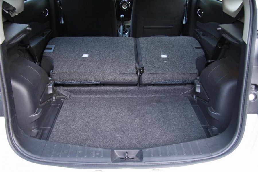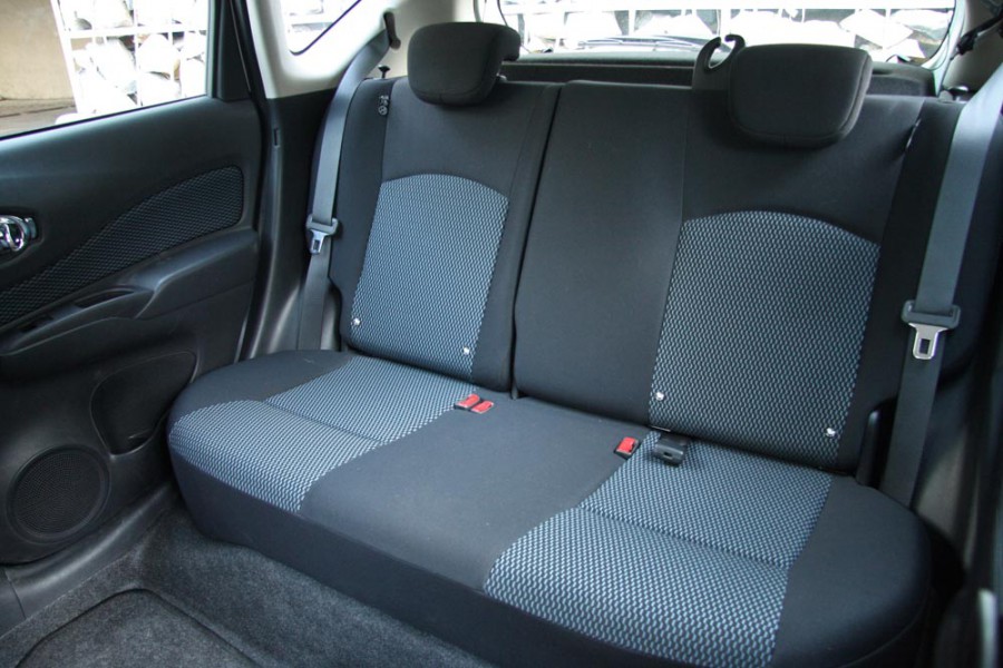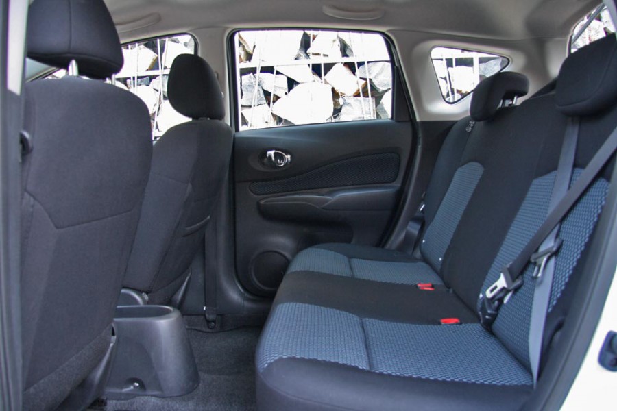 Στο σημείο που εντυπωσιάζει η καμπίνα του νέου Note είναι στον άπλετο χώρο που προσφέρει για τα γόνατα των πίσω επιβατών και μπορεί να συγκριθεί με πολύ μεγαλύτερων αυτοκινήτων, ακόμα και της μεσαίας κατηγορίας. Επιπλέον, υπάρχει αρκετό ωφέλιμο ύψος και πλάτος, ενώ το χαμηλό κεντρικό τούνελ διευκολύνει τη μετακίνηση ενός τρίτου φιλοξενούμενου στο πίσω κάθισμα. Φυσικά πολύ άνετοι είναι και οι διαθέσιμοι χώρο και για τους εμπρός επιβάτες. Μεγάλος με την σειρά του (για τα δεδομένα της μικρής κατηγορίας) είναι και ο χώρος αποσκευών των 325 λίτρων (μαζί με τα 30 λίτρα κάτω από το δάπεδο του πορτ μπαγκάζ). Αρνητικό στοιχείο αποτελούν οι τονισμένοι θόλοι των τροχών που περιορίζουν εν μέρει το ωφέλιμο πλάτος του αποθηκευτικού χώρου. Την πρακτικότητα αυξάνουν το διπλό δάπεδο του χώρου αποσκευών (karakuri) και το συρόμενο πίσω κάθισμα σε διαδρομή 16 εκατοστών, το οποίο στην πιο μπροστινή θέση αυξάνει την χωρητικότητα στα 411 λίτρα. Αμφότερα τα χρηστικά αυτά στοιχεία περιλαμβάνονται στο πακέτο Family  μαζί με πίσω υποβραχιόνιο, φιμέ πίσω παράθυρα και ζάντες αλουμινίου 16 ιντσών.