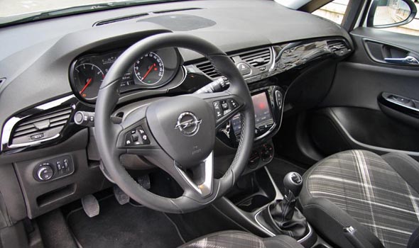 Πλήρως ανανεωμένο τόσο σε σχεδίαση όσο και σε ποιότητα είναι το εσωτερικό του νέου Corsa. Το μεγαλύτερο μέρος στο πάνω μέρος του ταμπλό καλύπτεται για πρώτη φορά -σε Corsa- από μαλακό ευχάριστο στην υφή πλαστικό, το οποίο βελτιώνει αισθητά την ποιότητα, σε συνδυασμό και με την πιο προσεγμένη από πριν συναρμογή των επιμέρους επιφανειών. Μόνο τα σκληρά πλαστικά στις εμπρός και κυρίως στις πίσω -δίχως ύφασμα- πόρτες δείχνουν σχετικά φθηνά. Μοντέρνος, ευανάγνωστος και πλήρης ενδείξεων είναι ο νέος πίνακας οργάνων και πιο σπορτίφ σχεδίαση έχει το ανάγλυφο τιμόνι. Την αναβαθμισμένη τεχνολογία τονίζει και η οθόνη αφής του συστήματος infotainment IntelliLink (εκτός της αρχικής έκδοσης Enjoy) με αρκετές λειτουργίες, όπως πλοήγηση, διαδικτυακό ραδιόφωνο, συνδέσεις USB, Bluetooth κ.α. Η πιο κομψή κονσόλα μαζί με τα περιστροφικά χειριστήρια του συστήματος εξαερισμού προέρχονται από το ADAM. Αμετάβλητοι παρέμειναν οι πολύ καλοί χώροι λόγω των ίδιων εξωτερικών διαστάσεων με του προγενέστερου Corsa. Στο πίσω κάθισμα θα φιλοξενηθούν δίχως παραχωρήσεις δύο ενήλικα άτομα, ενώ ο πλήρως εκμεταλλεύσιμος τετραγωνισμένος χώρος αποσκευών έχει χωρητικότητα 285 λίτρων.