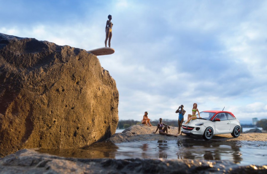 Opel ADAM μινιατούρες υπό κλίμακα 1:43 πρωταγωνιστούν στο σκηνικό που προσέφεραν ο ποταμός Ρήνος και ο κεντρικός σταθμός του Wiesbaden. Στόχος του φωτογραφικού project του Axel Wierdemann με πρωταγωνιστή το ADAM ήταν η δημιουργία ενός νέου κόσμου εικόνων που όμως θα παρέμενε το δυνατόν ρεαλιστικός και αυθεντικός. Ο Wierdemann φωτογράφισε συμβατικές μινιατούρες και χαρακτήρες από μικρή απόσταση και με μεγάλη διάρκεια διαφράγματος, παίζοντας δυνατά με απλά αλλά πολύ ευφυή εφέ φωτισμού. Μικρά καθημερινά αντικείμενα μεταμορφώνονται ώστε παίξουν εντελώς διαφορετικούς ρόλους. Για παράδειγμα, ένα ξυλάκι παγωτού μεταμορφώνεται σε σανίδα καταδύσεων σε πισίνα, ενώ κινηματογραφικά εισιτήρια δημιουργούν ένα τέλειο κόκκινο χαλί μπροστά από ένα εντυπωσιακό φόντο. Οι φωτογραφίες δίνουν την εντύπωση ότι έχουν τραβηχτεί σε διαφορετικές εποχές και χώρες ενώ το σκηνικό στήθηκε κοντά στην κατοικία του φωτογράφου στην περιοχή Rhine-Main, πολύ κοντά στην έδρα της Opel στο Rüsselsheim.