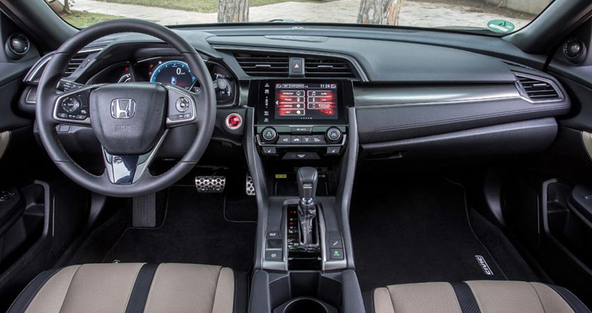 Εντελώς νέο είναι και το εσωτερικό του Civic με τον πιο κομψό αλλά σπορτίφ σχεδιασμό, την σημαντικά βελτιωμένη εργονομία και τους πιο μεγάλους χώρους. Ποιοτικά τόσο τα μαλακά πλαστικά στο ταμπλό όσο και τα σκληρά, συνθέτουν μαζί με το προσεγμένο φινίρισμα και την συναρμογή ένα σύνολο που θα ικανοποιήσει με το παραπάνω. Αισθητή βελτίωση έχει γίνει εργονομία μέσω και του ενιαίου ψηφιακού πίνακα οργάνων, αντί του διπλού που υπήρχε στα προηγούμενα Civic, ενώ πολύ καλύτερη είναι και η θέση οδήγησης λόγω του πιο χαμηλά τοποθετημένου καθίσματος. Την σύγχρονη εικόνα ενισχύει με την σειρά του το νέας γενιάς σύστημα πολυμέσων Honda Connect με την έγχρωμη οθόνη αφής των 7 ιντσών (στάνταρ στις εκδόσεις Elegance και Sport). Αισθητά βελτιωμένοι με την σειρά τους είναι και οι χώροι για όλους τους επιβάτες, ενώ οι πίσω φιλοξενούμενοι θα νιώσουν πιο άνετα (+95 χλστ. ο χώρος για τα πόδια) χάρη και στα μεγαλύτερα παράθυρα. Πολύ μεγάλο είναι με την σειρά του το πορτ μπαγκάζ των 478 λτ. με το νέο και πολύ πρακτικό συρόμενο προς το πλάι κάλυμμα του χώρου αποσκευών.