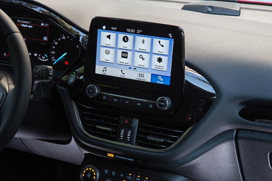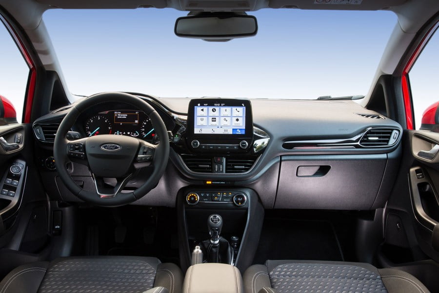 Εντελώς νέο είναι το εσωτερικό του 8ης γενιάς Fiesta, με πιο μινιμάλ σχεδίαση, βελτιωμένη ποιότητα και καλύτερη εργονομία. Στο ταμπλό με τις απαλές καμπύλες κυριαρχεί η μεγάλη οθόνη αφής τύπου tablet των 8 ιντσών του συστήματος πολυμέσων SYNC3 (4,2 ιντσών στην έκδοση Trendκαι 6,5 ιντσών στην Business), στην οποία έχουν ενσωματωθεί διάφορες λειτουργίες του αυτοκινήτου, ενώ έτσι μειώθηκαν κατά 50% οι διακόπτες προς όφελος και της εργονομίας. Νέο στοιχείο αποτελεί και το υψηλής απόδοσης ηχοσύστημα B&O Play της Bang & Olufsen, με απόδοση 675 watt, 10 ηχεία και subwoofer. Στον εξοπλισμό του νέου Fiesta περιλαμβάνονται πλέον και πολλά συστήματα υποστήριξης του οδηγού, όπως είναι η Υποβοήθηση διατήρησης λωρίδας, Προειδοποίηση εκτροπής από τη λωρίδα, Σύστημα περιορισμού της ταχύτητας, Σύστημα αυτόνομης πέδησης, Προειδοποίηση οχήματος σε τυφλό σημείο κ.λπ.
