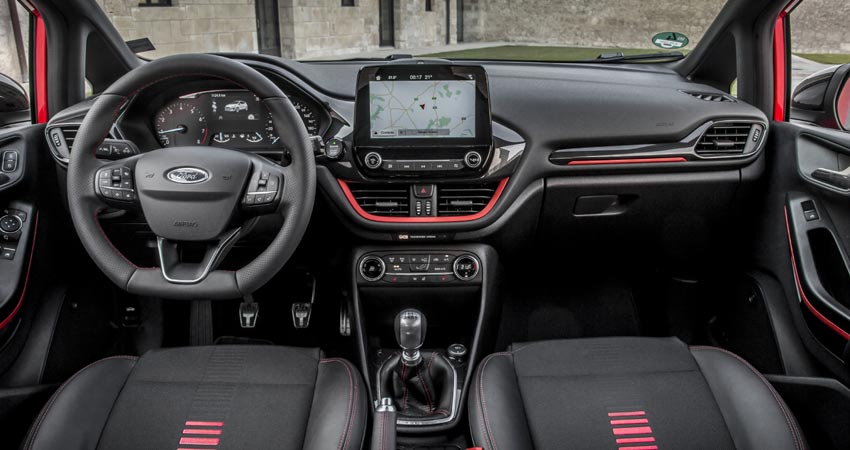 Η καμπίνα των επιβατών του νέου Fiesta δεν θυμίζει σε τίποτα αυτήν του προηγούμενου, σε ένα αποτέλεσμα πολύ πιο σύγχρονο και μοντέρνο. Βελτιώσεις έχουμε στα στοιχεία τεχνολογίας, ιδίως από τη στιγμή που υπάρχει και μια νέα 6,5 ή 8 ιντσών οθόνη αφής στην κονσόλα για το σύστημα πολυμέσων, ενώ και τα υλικά που έχουν χρησιμοποιηθεί είναι πιο ποιοτικά από ποτέ. Ειδικά στο πεδίο της ποιότητας, η έκδοση Vignale έρχεται για προσφέρει υψηλή πολυτέλεια μέσω της παρουσίας νέων και πολύ ποιοτικών δερμάτινων επενδύσεων στα καθίσματα με εξάγωνο μοτίβο, αλλά και αντίστοιχων δερμάτων σε ένα μεγάλο τμήμα του ταμπλό, καθώς και σε τμήμα του εσωτερικού των θυρών. Στην περίπτωση του Fiesta ST-Line το εσωτερικό διαθέτει πιο σπορ καθίσματα που δεν περιορίζουν όμως της άνεση, αλουμινένια πεντάλ, σπορ τιμόνι με επίπεδο κάτω τμήμα και πιο χοντρή στεφάνη με κόκκινες ή λευκές ραφές, αλλά και νέα σπόιλερ εισόδου που αναγράφουν «ST-Line». Στα υπόλοιπα στοιχεία τους οι δύο νέες εκδόσεις δεν διαφοροποιούνται συγκριτικά με τις «απλές» εκδόσεις του Fiesta, προσφέροντας καλούς χώρους για 4 ενήλικες στο εσωτερικό και πορτ-μπαγκάζ με καλή χωρητικότητα 293 λίτρων.