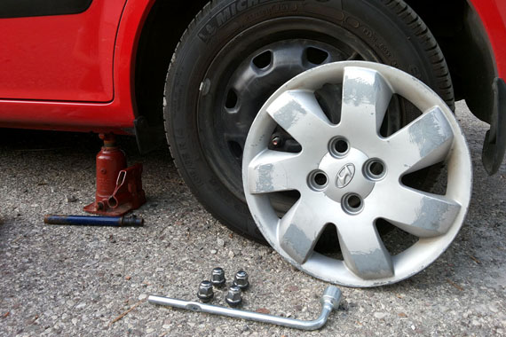 1. Πρώτα αφαιρούμε τα τάσια από τους τροχούς. Σε πολλά αυτοκίνητα αφαιρούνται αφού τραβηχτούν με λίγη δύναμη, ενώ σε άλλα είναι βιδωμένα μαζί με τα μπουλόνια, τα οποία πρέπει να ξεβιδωθούν.