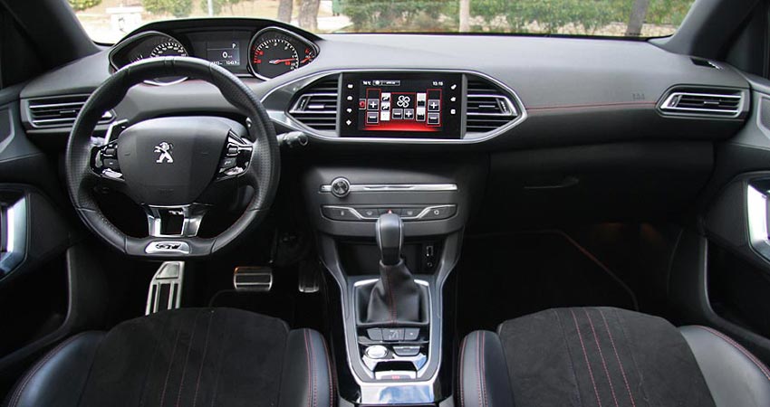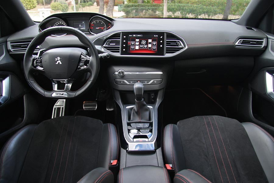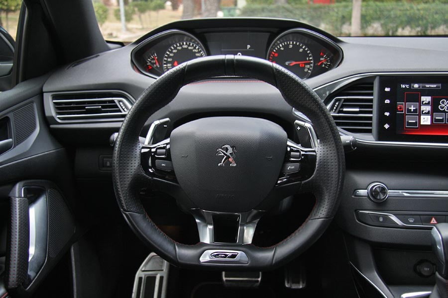 Όπως ακριβώς με το αμάξωμα, έτσι και στο εσωτερικό του 308 GT η Peugeot καθιστά σαφή τον σπορ χαρακτήρα του αυτοκινήτου, χωρίς να προχωρά σε λύσεις εντυπωσιασμού. Έτσι λοιπόν, υπάρχουν αρχικά νέα καθίσματα που προσφέρουν καλύτερη στήριξη του σώματος χωρίς να χάνουν σε άνεση, τα οποία επενδύονται με πιο πολυτελή υλικά όπως δέρμα και αλκαντάρα, ενώ έχουν και κόκκινες ραφές. Σπορτίφ διαστάσεις διαθέτει και το τιμόνι με το επίπεδο κάτω τμήμα που αναγράφει «GT», ενώ υπάρχουν νέες επενδύσεις σε χρώμιο και μαύρη λάκκα, αλλά και μια μεγάλη οθόνη αφής (9,7 ιντσών) στο κέντρο του ταμπλό για το σύστημα πολυμέσων. Ξεχωριστή νότα στο εσωτερικό δίνει η παρουσία του διακόπτη Sport, ο οποίος εκτός του ότι εμπλέκει τη νέα χαρτογράφηση του μοτέρ και του κιβωτίου για καλύτερη απόκριση και πιο γρήγορες αλλαγές σχέσεων, αλλάζει και το χρωματισμό των οργάνων από λευκό σε έντονο κόκκινο. Στο πεδίο της ποιότητας, τα δεδομένα στο εσωτερικό του 308 GT είναι πολύ καλά, με συναρμογή και φινίρισμα χωρίς προβλήματα, αλλά και άφθονο μαλακό πλαστικό στο ταμπλό. Οι χώροι παραμένουν σε πολύ καλά επίπεδα για 5 ενήλικες, με μεγάλο πορτ-μπαγκάζ 420 λίτρων.