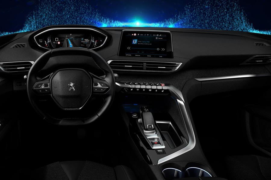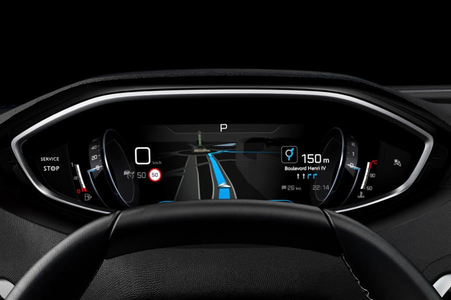 Σχεδιαστικά το νέο i-Cockpit είναι αρκετά εντυπωσιακό και ξεχωρίζουν οι δύο μεγάλες οθόνες στο ανώτερο τμήμα του δύο επιπέδων ταμπλό. Αυτή που βρίσκεται πάνω από το μικρής διαμέτρου τιμόνι είναι ουσιαστικά ένας ψηφιακός πίνακας οργάνων με οθόνη 12,3 ιντσών, ενώ αυτή που βρίσκεται στο κέντρο του ταμπλό αποτελεί την κύρια οθόνη τύπου τάμπλετ 8 ιντσών, όπου απεικονίζονται οι διάφορες λειτουργίες του συστήματος infotainment.