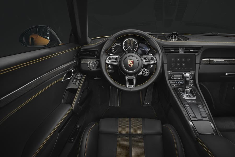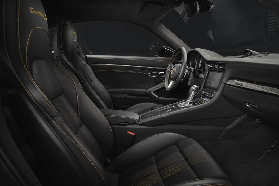 Στο εσωτερικό της μοναδικής αυτής 911 Turbo S, συναντούμε νέα σπορ μαύρα δερμάτινα καθίσματα με χρυσές ραφές, επένδυση αλκαντάρα στην οροφή, επιπλέον carbon επενδύσεις και ειδική πλακέτα με τον αριθμό κατασκευής του κάθε αυτοκινήτου.