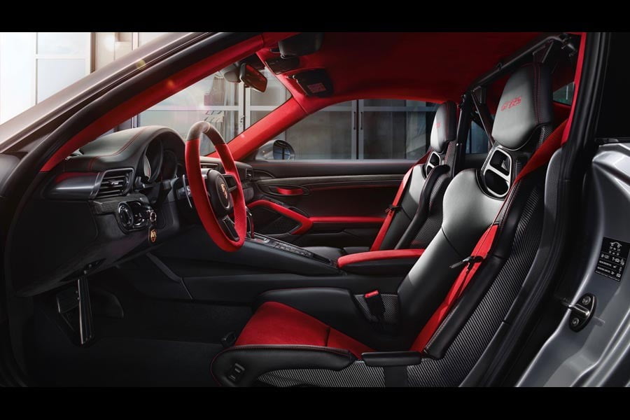 Σπορ και πολυτελές είναι το εσωτερικό της Porsche 911 GT2 RS με τις επενδύσεις δέρματος και αλκαντάρα σε αποχρώσεις κόκκινου – μαύρου και τα διακοσμητικά από ανθρακόνημα. Από το ίδιο υλικό είναι κατασκευασμένα και τα μπάκετ καθίσματα.